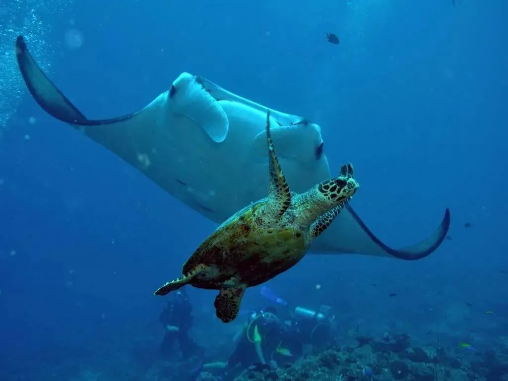 阿里环礁以中上层鱼类而闻名,但北马累环礁与之相比也毫不逊色。此外,位于环礁东南部的Manta Point也是著名的魔鬼鱼观赏点,在每年的五月至十月西南季风活跃期间,魔鬼鱼聚集在这里觅食。海礁上满是五颜六色的珊瑚和各种各样的海洋生物。