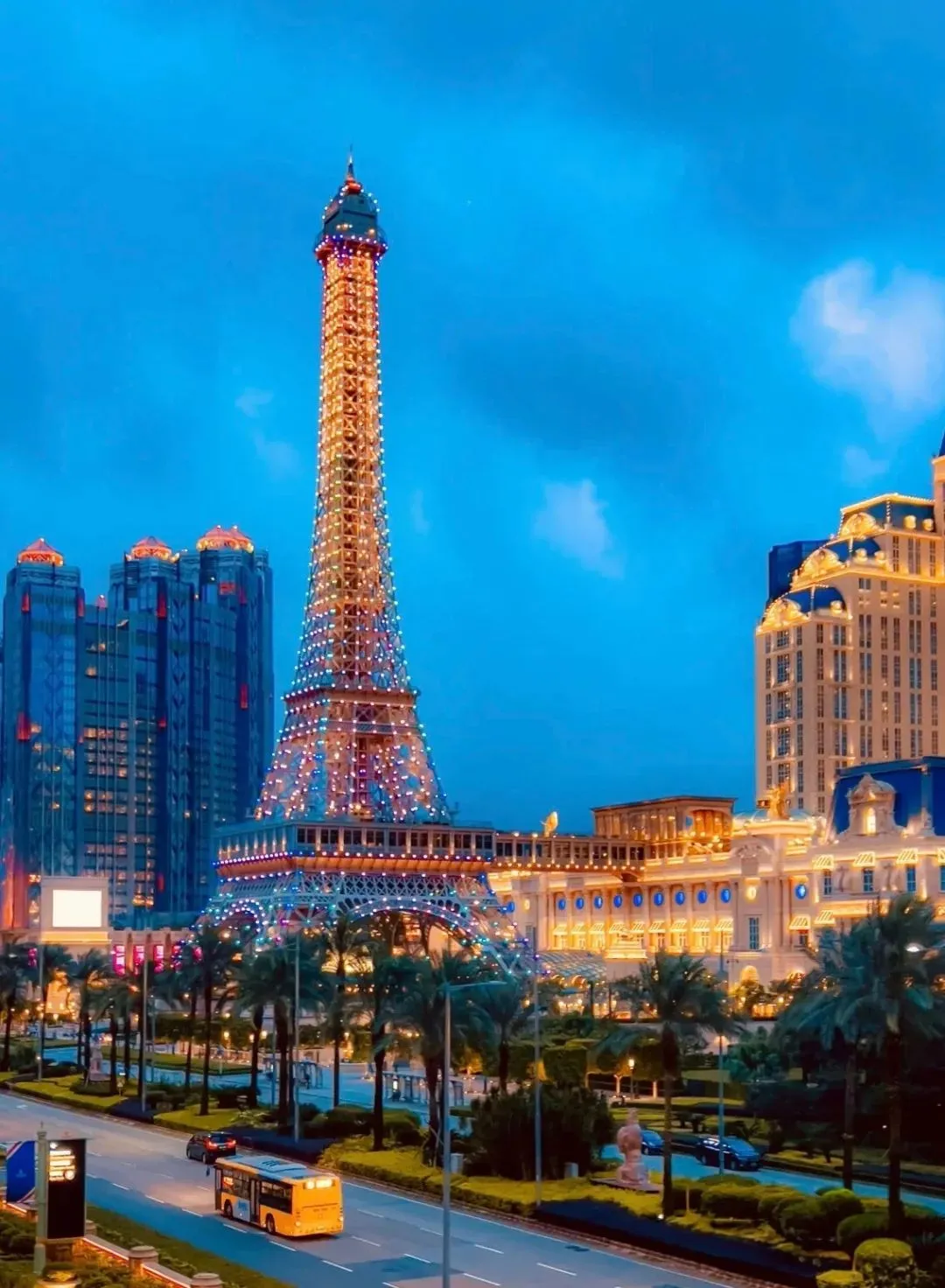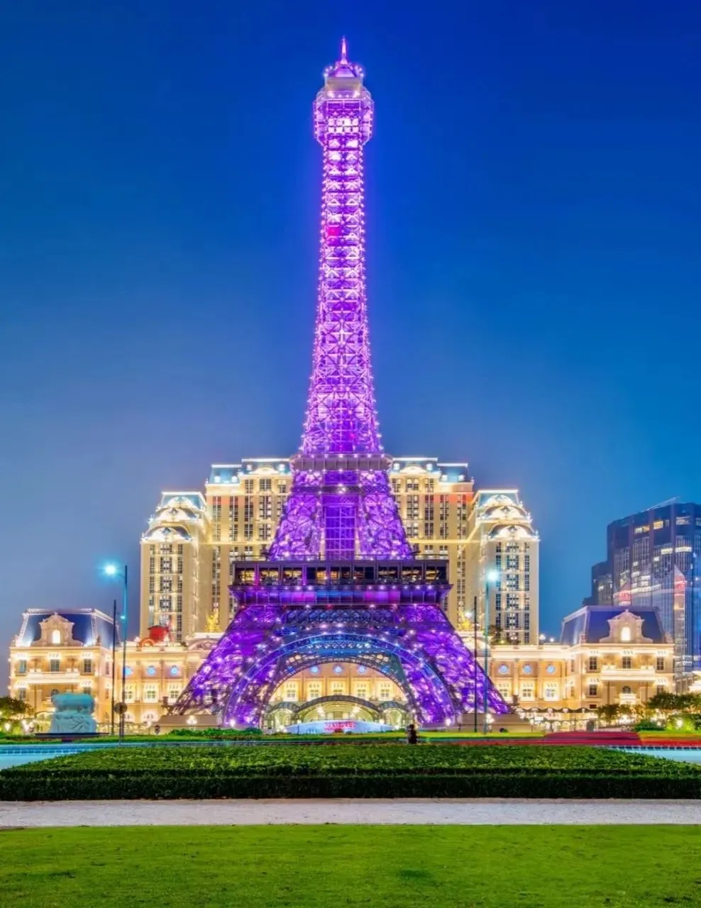 澳门巴黎铁塔位于澳门巴黎人酒店前,按埃菲尔铁塔等比缩小一半建造,