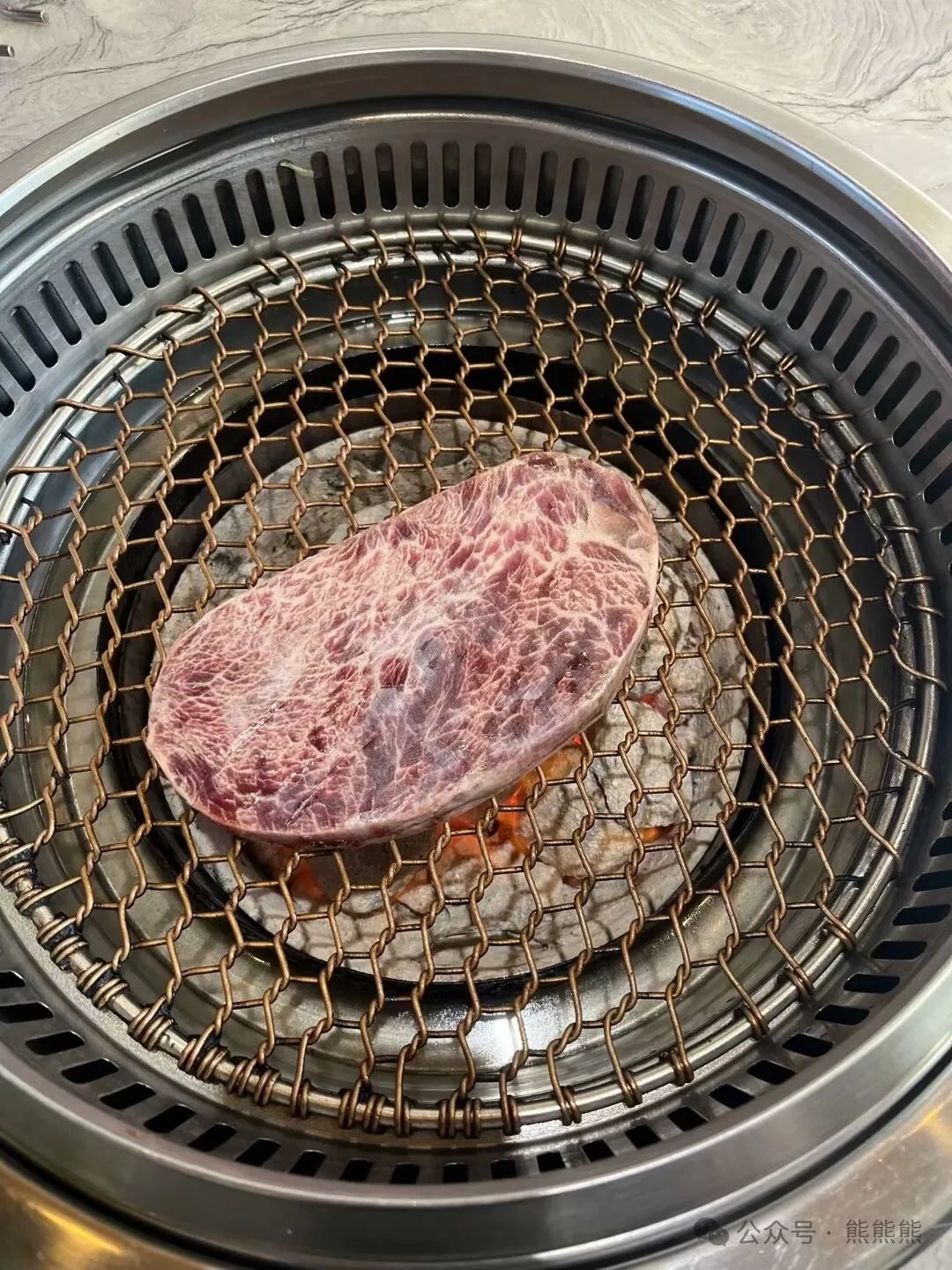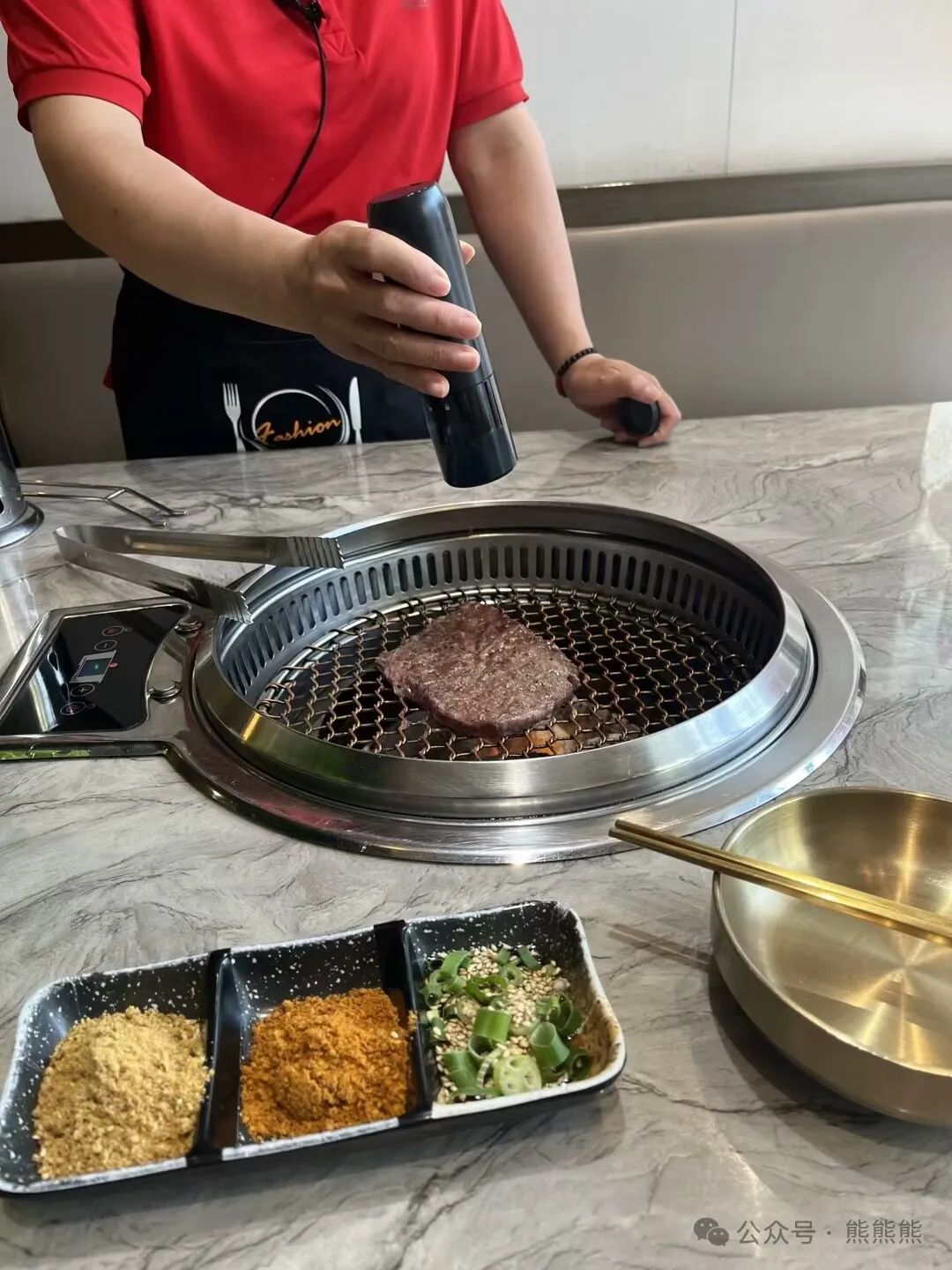 这家店蘸料丰富,设备也很厉害,这个炉子的炭火是可以升降的,升上来就是旺火炙烤,降下去就是文火保温,可好用了!而且服务员都很热情地帮忙烤,烤得很专业
