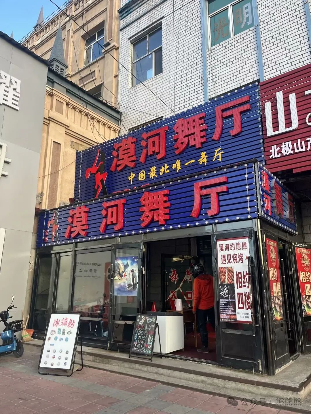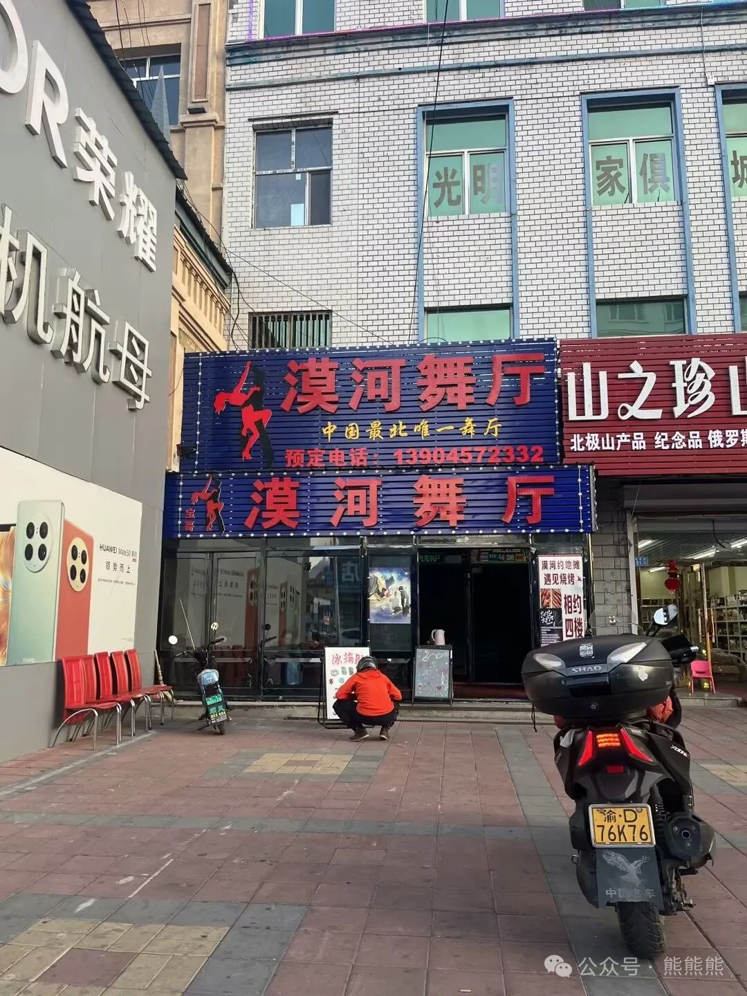 逛到传说中的漠河舞厅,三千里,偶然见过你。正好漠河舞厅那首歌故事里的男主人公就是从苏州到的漠河,我也是从苏州过来。这个从重庆开过来的大哥,蹲在门口看漠河舞厅的冰箱贴