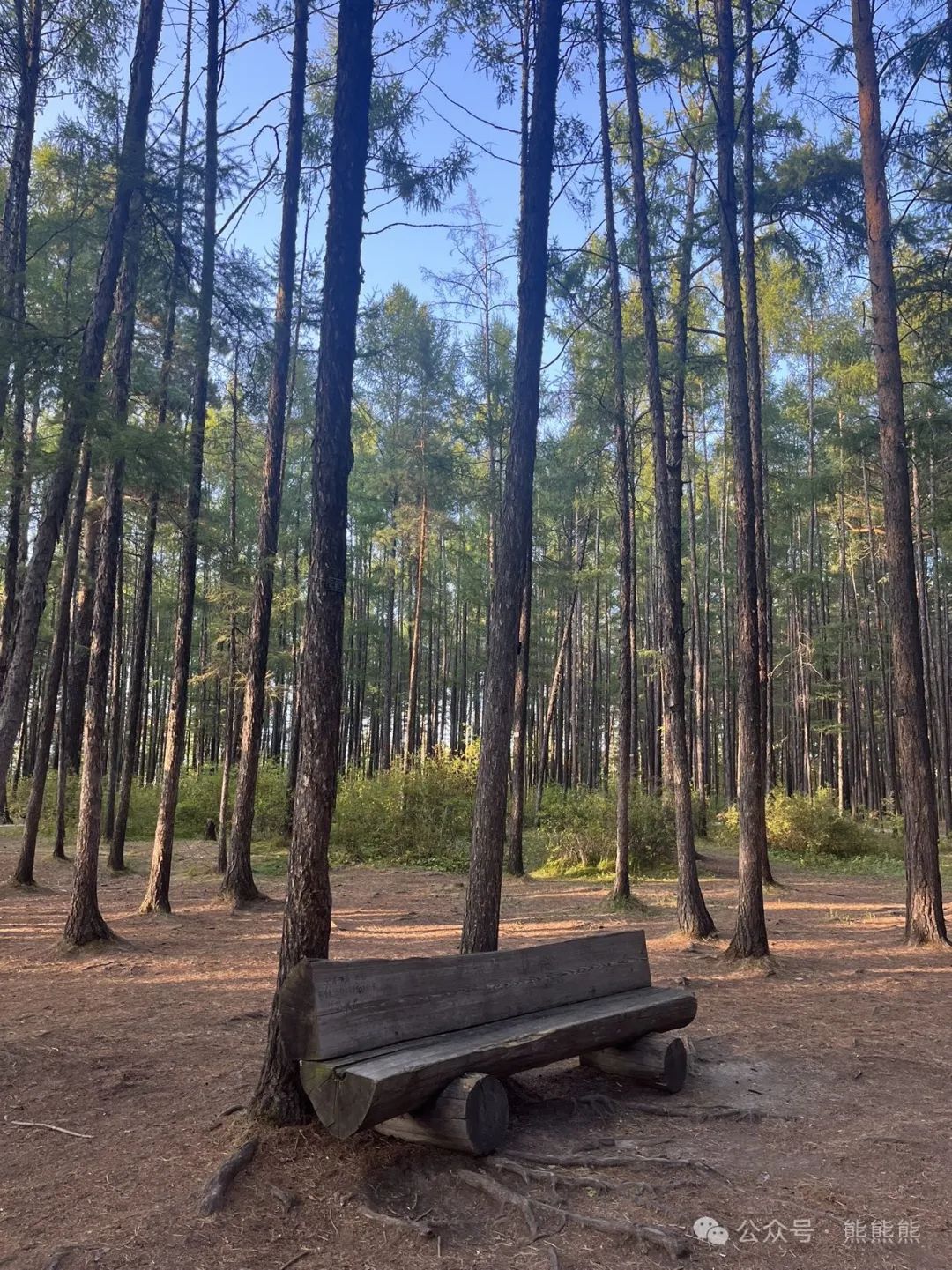 椅子做得也很美。坐在这个椅子上听着松涛声,剥小松塔吃,闻着松油香,超级舒服。后来还遇到个遛狗的大姐,带着三只雪纳瑞,跟壮壮狂追一通开心死了