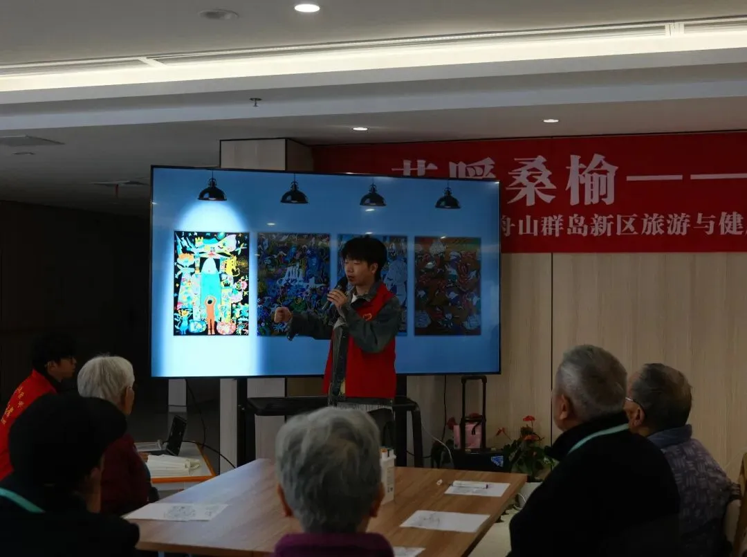 活动伊始,团队指导老师张寒璐通过精心准备的PPT,以通俗易懂、亲切生动的语言,向长者们介绍了舟山渔民画的艺术特色与文化内涵,并分享了合作传承人郑红飞老师画作背后的海洋故事。一幅幅色彩绚烂、充满生命张力的画作,迅速点燃了长者们的创作热情。