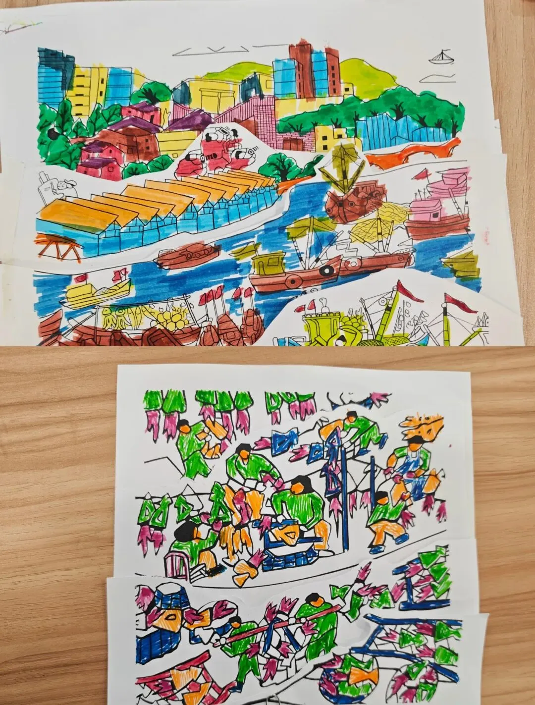 运用数字渔民画元素卡片,在画纸上自由拼贴、配色,共同绘制心中的海洋图景。