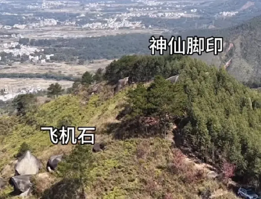 离神仙脚印石不远处,一块形似飞机的巨石巍然矗立。石身长约十丈,前端尖锐如机首,两侧伸展如机翼,形态逼真得令人惊叹。