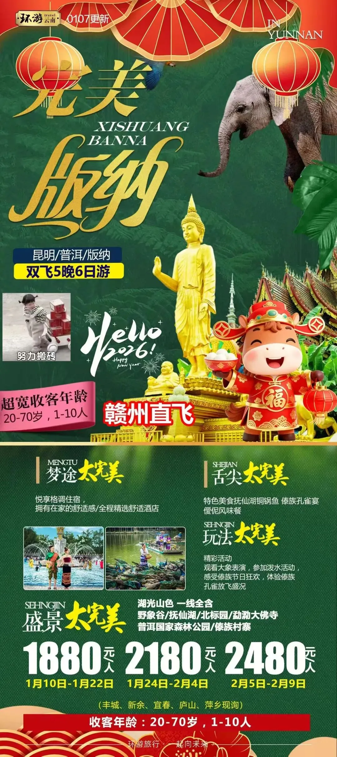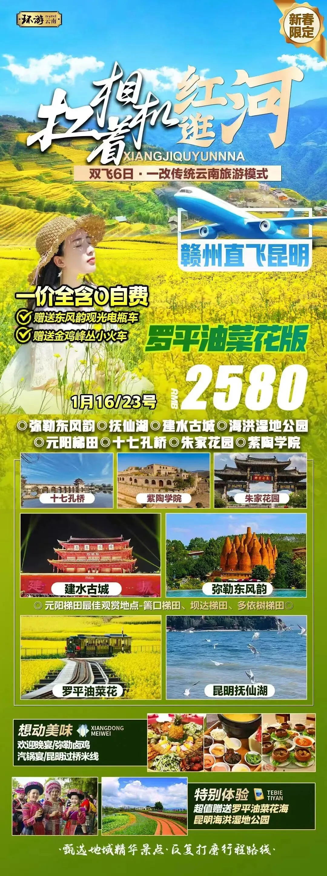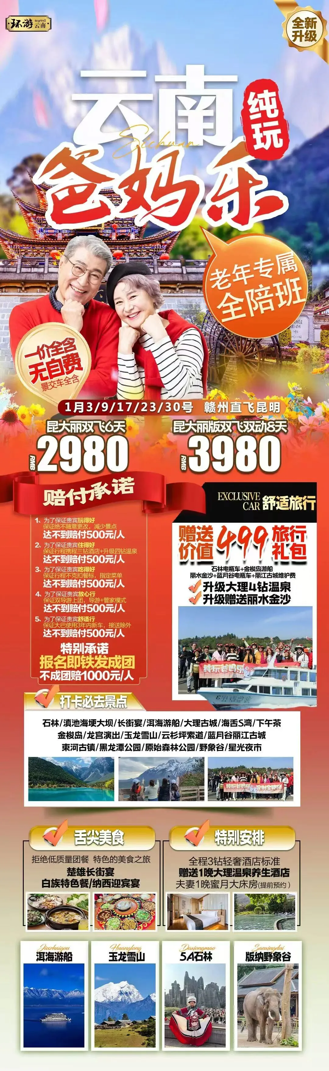 云南昆大丽双飞6日游2980元,昆大丽+版纳双飞双动8日游3980元,老年团