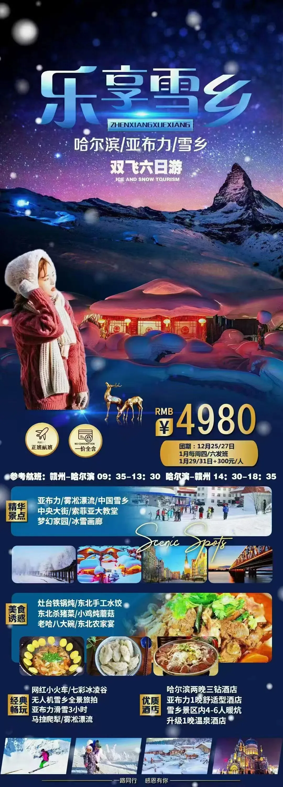 哈尔滨+亚布力+雪乡双飞6日游4980元