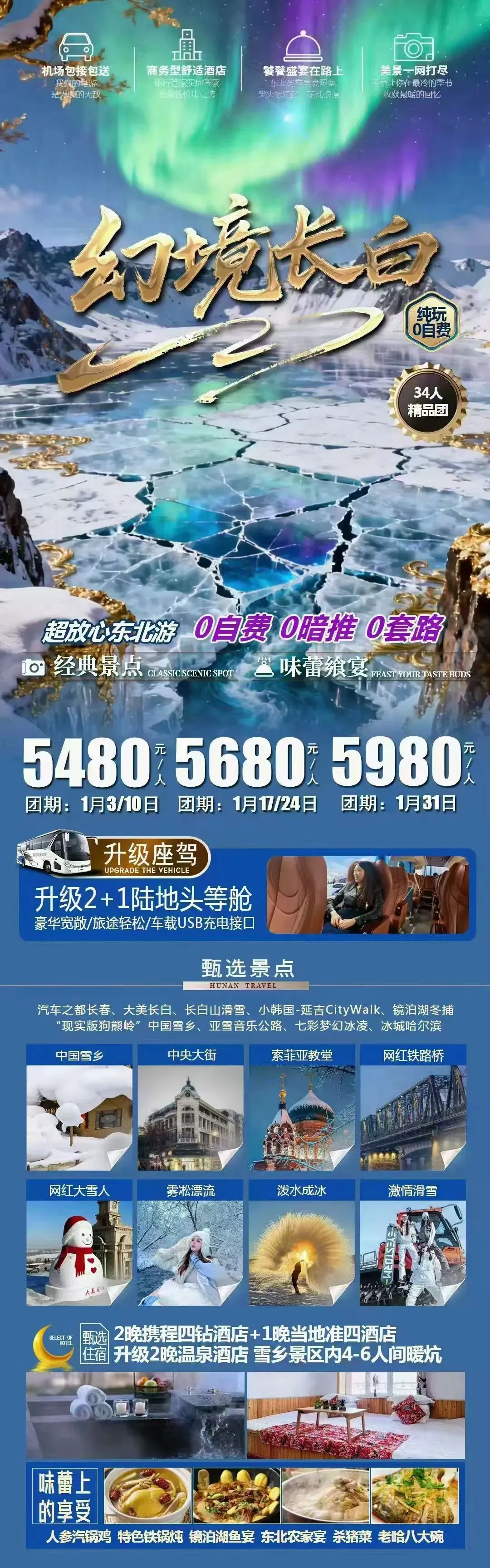 长春+长白山+延吉+雪乡+哈尔滨双飞6日游5680元
