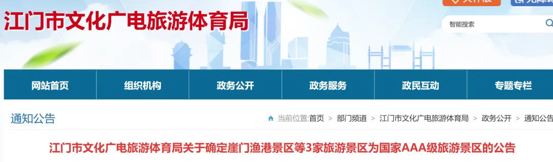 根据中华人民共和国国家标准《旅游景区质量等级的划分与评定》和《旅游景区质量等级管理办法》,江门市文化广电旅游体育局按程序组织综合评定并于2026年1月12日完成公示,确定崖门渔港景区、无限极养生文化基地景区、塘口旧墟旅游区等3家旅游景区为国家AAA级旅游景区。