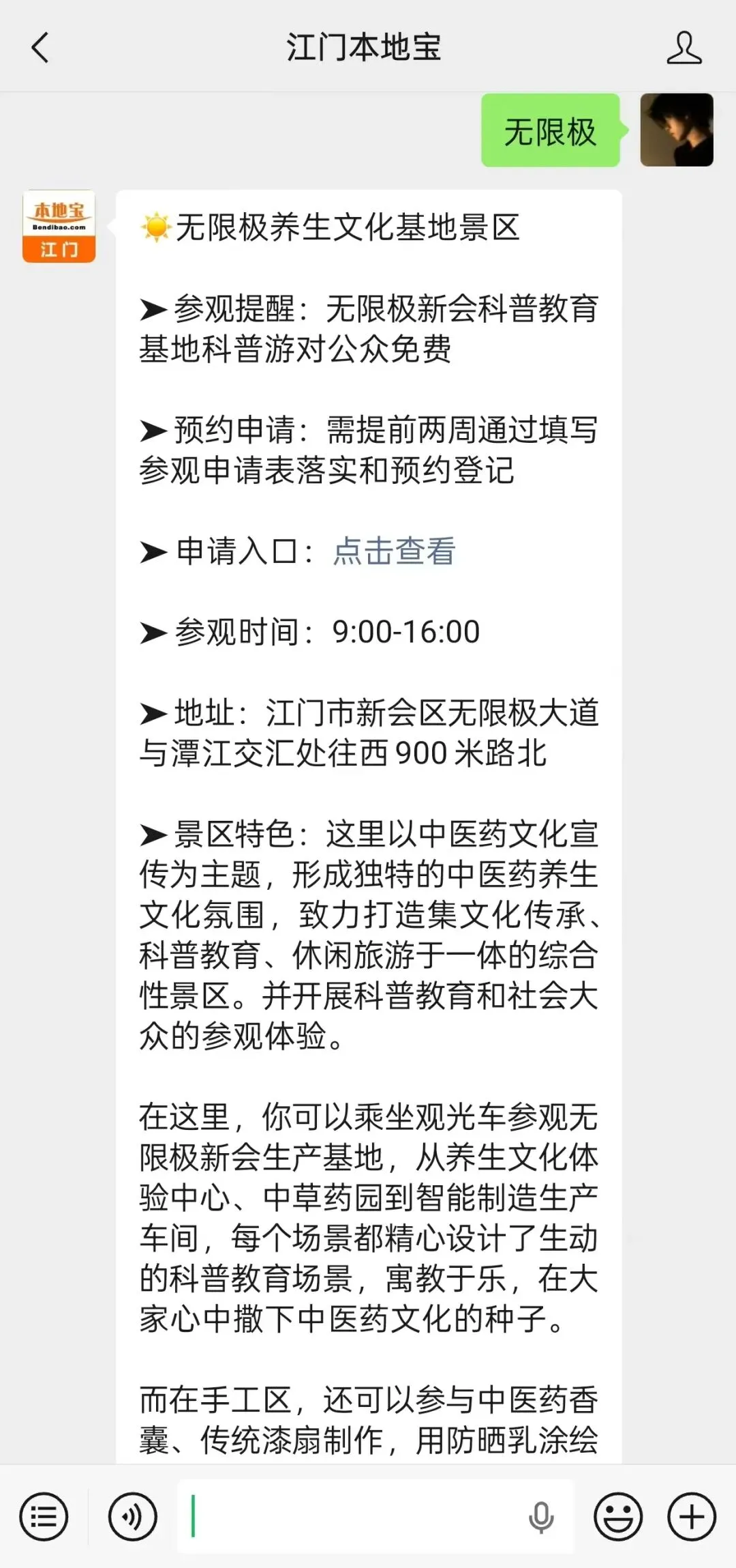 🙋也可以关注【江门本地宝】微信公众号聊天对话框回复【无限极】即可获取无限极养生文化基地景区预约入口、参观时间等信息!