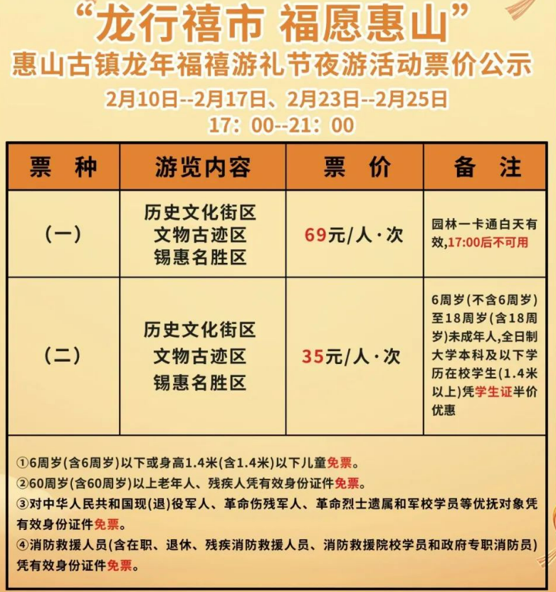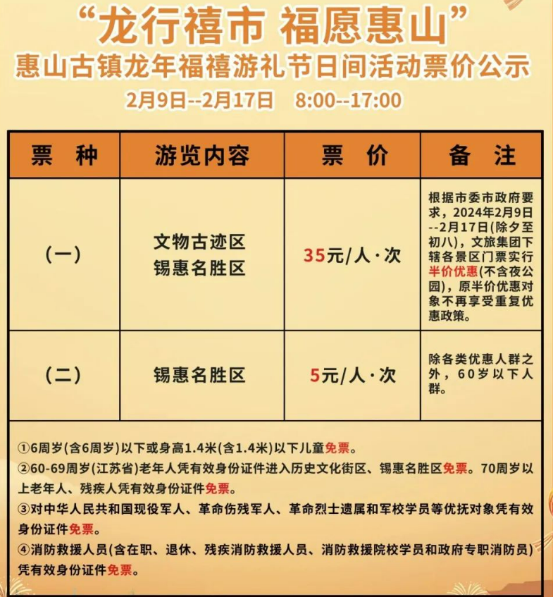 2月9日至2月17日,惠山古镇为市民游客带来半价游园优惠,具体免票及优惠如下: