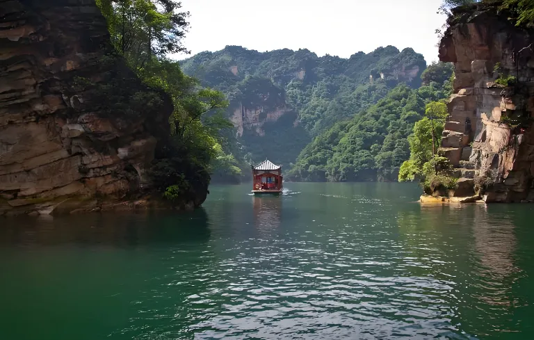 第四:宝峰湖高峡平湖,宝峰飞瀑如银练垂空。乘画舫游湖,赏“飞流直下三千尺”的壮阔。门票含游船,淡季71元,旺季96元。禾田居度假酒店邻黄龙洞,别墅式设计融合土苗文化,漏天浴缸享山景泡汤。