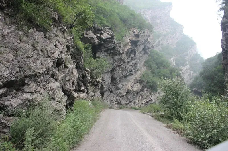 这“一线天”,两侧山崖如刀劈斧削般直插云霄,抬头望去,黝黑的巨石悬于半空,仿佛不知名的巨兽探头瞅着沟中穿行的人们,透着几分威严与压迫。左右两侧的杂树歪歪扭扭,枝桠交错缠绕,恨不得将这条天然夹缝彻底封死。唯有大晴天的正午,才有一缕细碎的光从崖缝中艰难挤入,弯弯曲曲、时隐时现,不清愿地射向沟底的路。路面顺着山势蜿蜒,最宽处不过三米,最窄处仅容一辆汽车的宽度。早已辨不清路面的原始材质,不像沥青,略似水泥,更多的是山体裸露的石头,被常年往来的车轮打磨得溜光锃亮,活脱脱像无数个大小不一的和尚光头。十几度的陡坡连着一串密集的S弯,绕得人头晕目眩,五脏六腑都跟着翻涌。