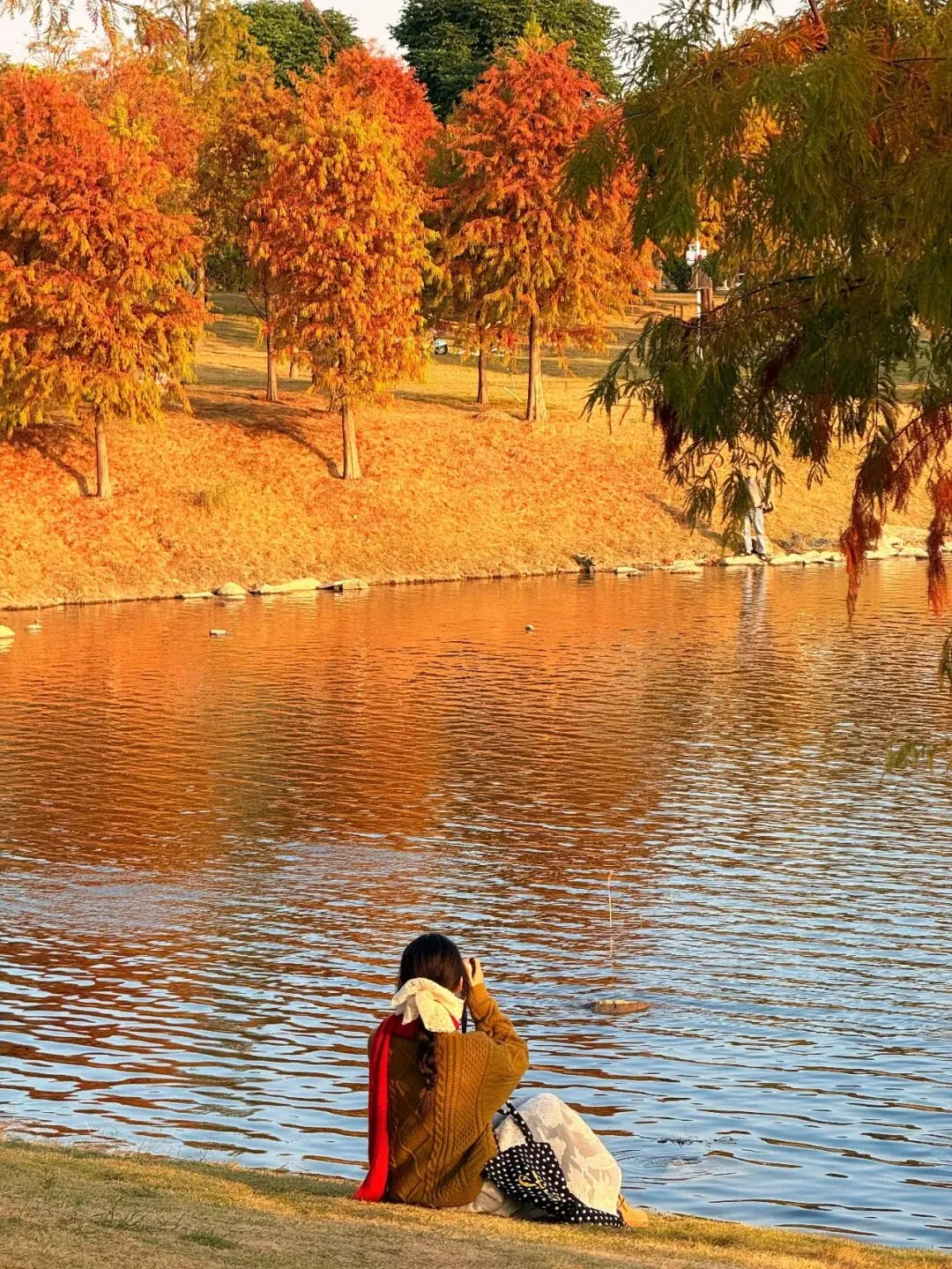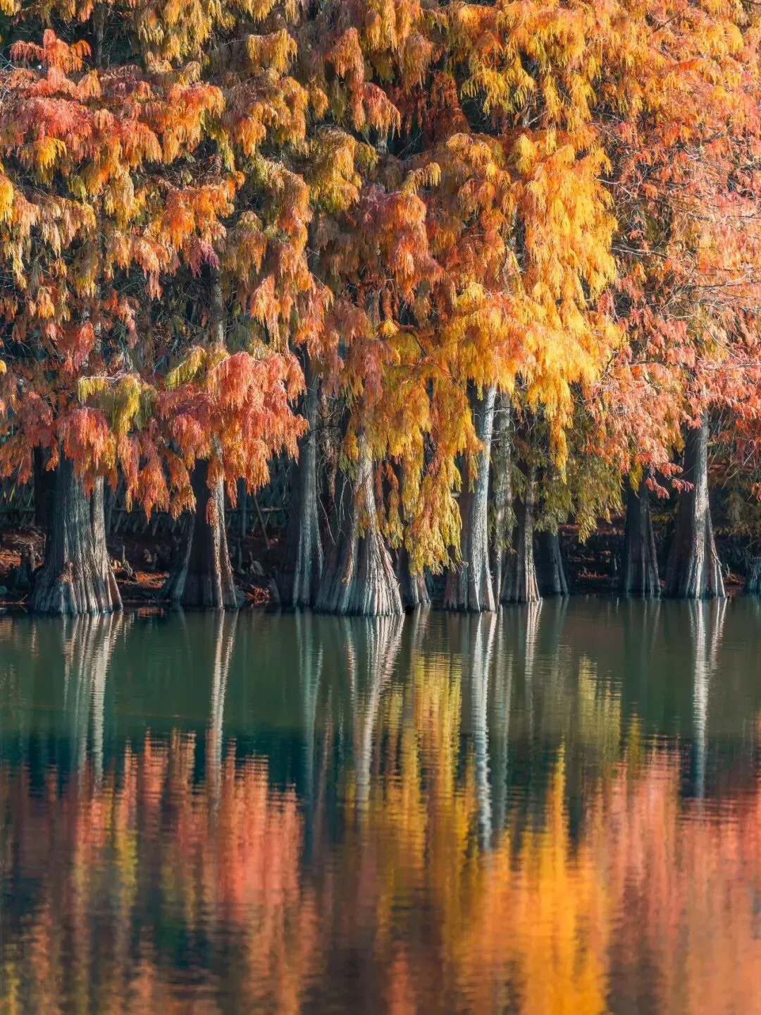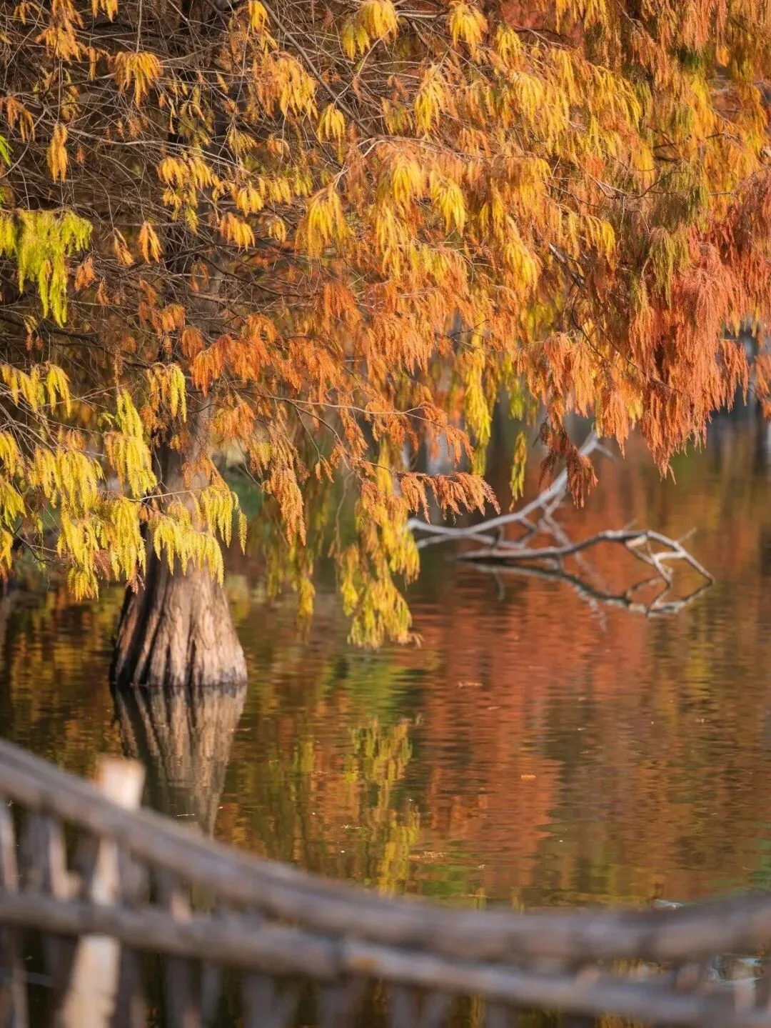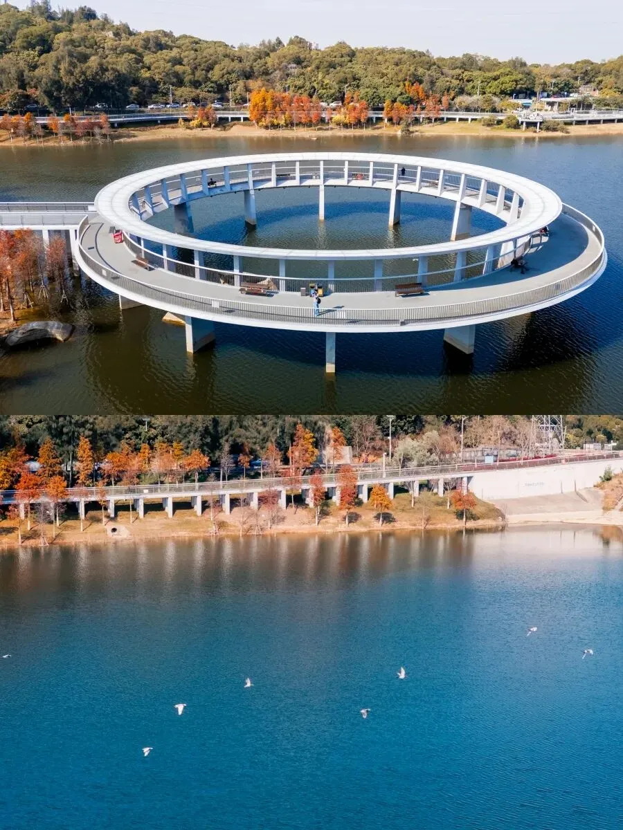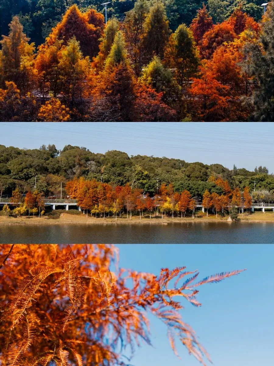 澄澈如宝石的湖面漾着细碎波纹,几羽飞鸟舒展着翅膀掠过水面,落羽杉染上了暖调的橙黄与绯红,这里人少景美,带家人散步、拍照两不误,推荐傍晚逆光拍剪影。