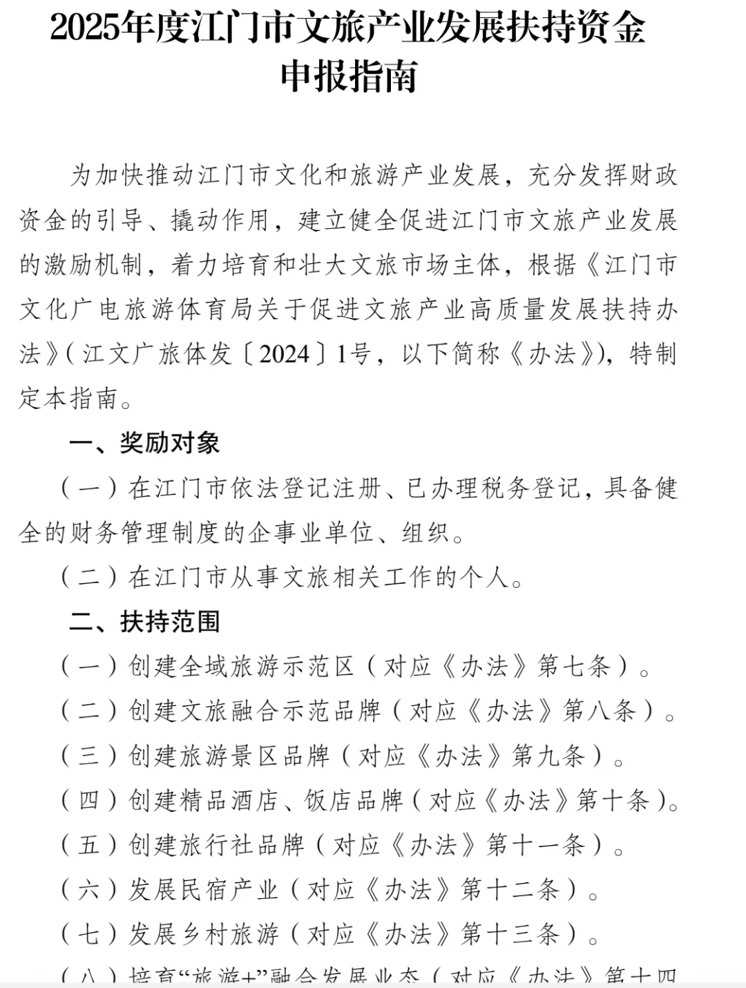 各县(市、区)文化广电旅游体育局: 为加快推动江门市文化和旅游产业发展,充分发挥财政资金的引导、撬动作用,建立健全促进江门市文旅产业发展的激励机制,着力培育和壮大文旅市场主体,根据《江门市文化广电旅游体育局关于促进文旅产业高质量发展扶持办法》(江文广旅体发〔2024〕1号,以下简称《办法》),对2025年在我市丰富旅游业态、扩大旅游知名度、提升旅游品质等方面做出贡献,符合《办法》规定扶持情形的企业、组织和个人进行资金扶持。为规范申报工作,我局根据《办法》制定了《2025年度江门市文旅产业发展扶持资金申报指南》,现印发给你们,请遵照执行。 请各县(市、区)文化广电旅游体育局组织本地区、本行业符合扶持条件要求的项目,于2025年8月7日至8月20日在江门市惠企利民服务平台提交电子申报材料,各县(市、区)文化广电旅游体育局于2025年8月22日前完成初审工作,初审通过后组织申报对象提交纸质申报材料,以县为单位统一报送江门市文化广电旅游体育局产业发展科。 特此通知。 附件:2025年度江门市文旅产业发展扶持资金申报指南 扫码下载附件