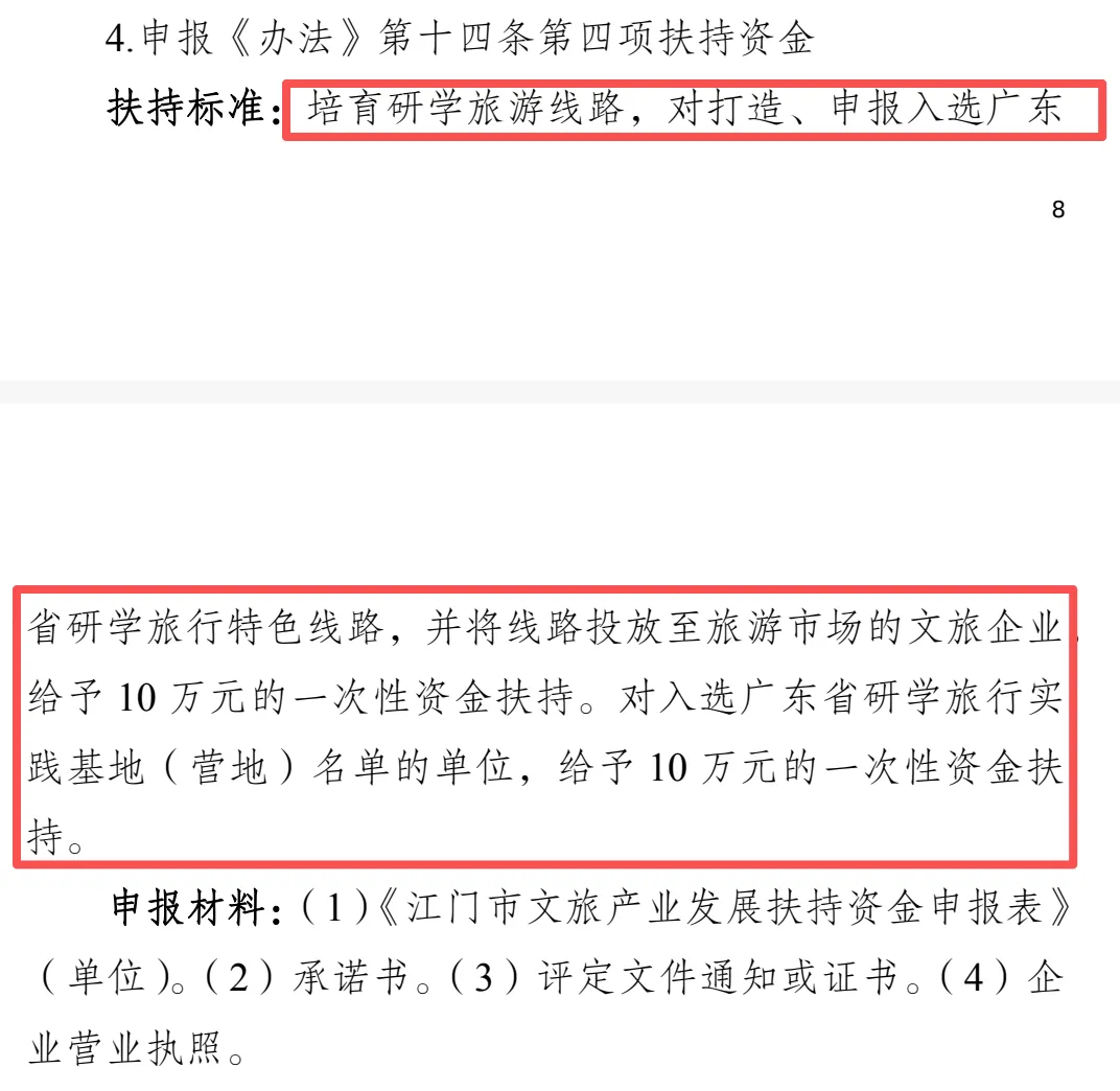 培育研学旅游线路——对打造、申报入选广东省研学旅行特色线路,并将线路投放至旅游市场的文旅企业,给予 10 万元的一次性资金扶持。对入选广东省研学旅行实践基地(营地)名单的单位,给予 10 万元的一次性资金扶持。
