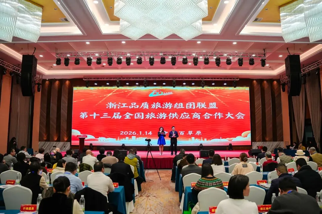 2026年1月14--15日,浙江品质旅游组团联盟第十三届旅游合作大会在安吉中南百草原召开,全国各地旅行社、景区、酒店580多名代表参加了会议。