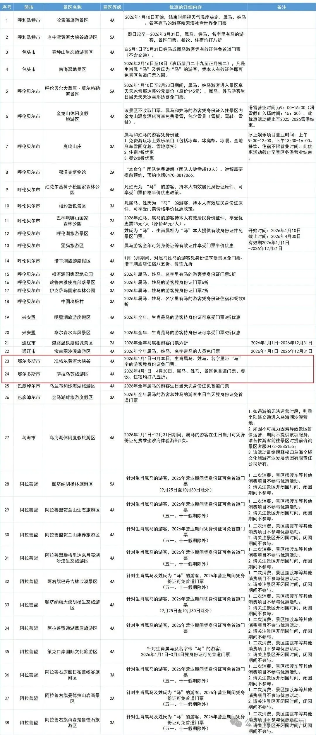 马年“马”优惠景区统计表