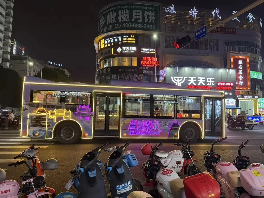 偶然在埌西夜市看到一辆闪闪发光的公交车,车身写着“邕城印象”,缠绕着彩灯。什么时候南宁的公交车变得那么漂亮了!
