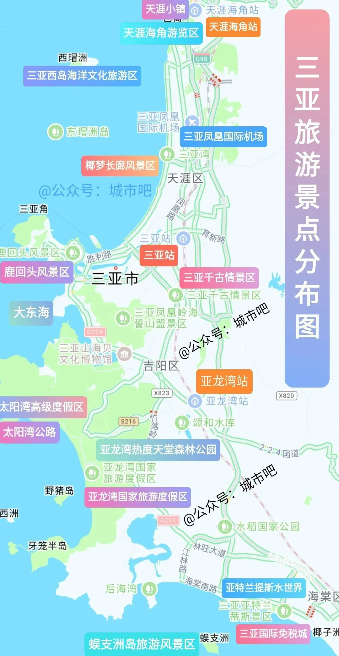 | 三亚 | 蜈支洲岛、亚龙湾、椰梦长廊、南山文化旅游区 | 参与丰富的水上项目,在热带天堂森林公园俯瞰亚龙湾,朝拜海上观音。 |