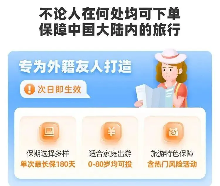 适用人群:一般为0周岁至80周岁,不论人在何处均可下单保障中国大陆内的旅行,专为外籍友人打造。