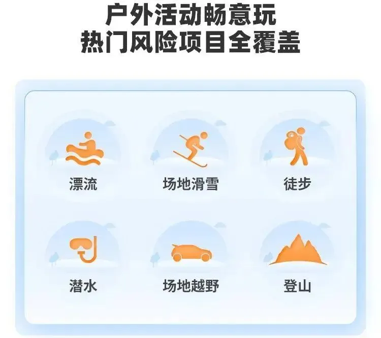 户外活动畅意玩热门风险项目全覆盖:漂流、潜水、场地滑雪、场地越野、徒步、登山。