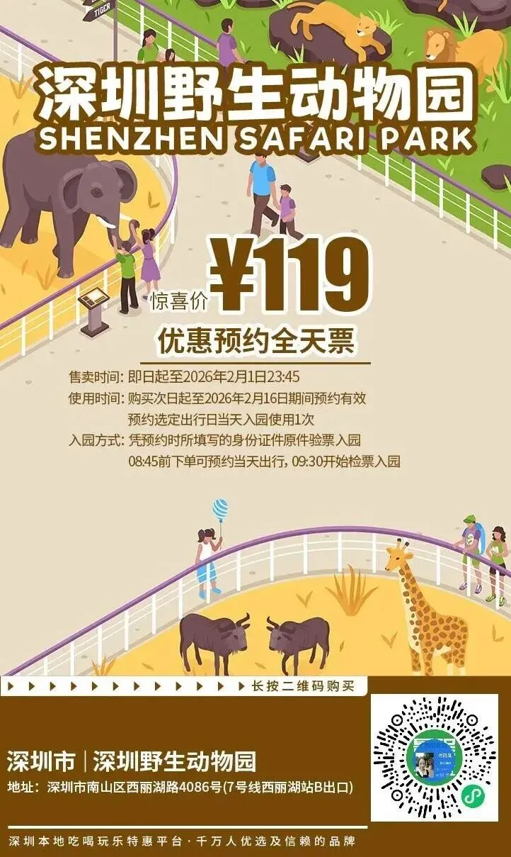 深圳特价景点门票8:45前可订当天!119元抢深圳野生动物园『优惠预约全日票』,购买次日起至2026年2月16日期间任选1天预约后入园限使用1次