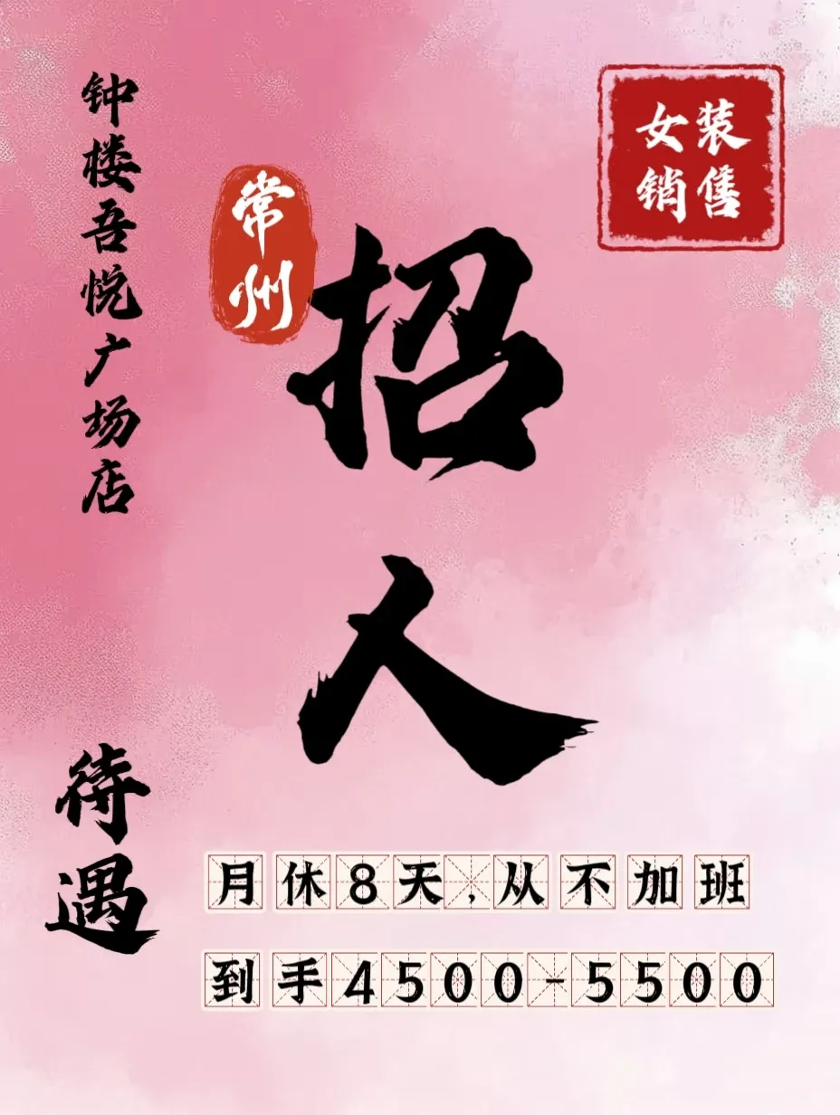 常州钟楼吾悦店,招全职女装销售,月休8-10天,每周2个全天班,3个半天班,收入4500-5500。