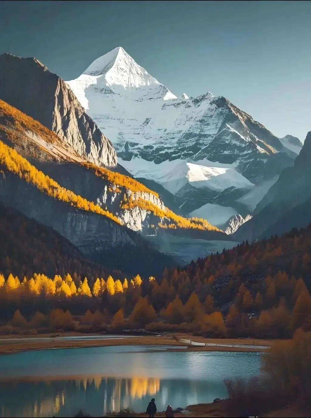 站在这儿,.你才会信童话里的.颜.色是.真的.。.长海的静,.五花.海的斑斓,诺日朗.瀑布的水汽扑在脸上.,凉丝丝的。秋天树林变黄变红,.倒映在水里.,像打翻了调色盘。