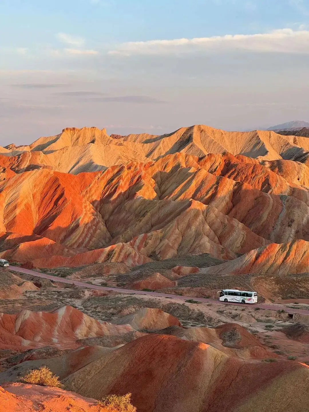 像.是把彩虹揉碎了按进土里。.坐景交.车在不同的观景.台之间转,颜色随着.阳光变,.早上是暖.橘,.傍晚成.了.紫红.。没有一棵树,就是纯粹、直接、磅.礴的.色.块.,看.久了有点晕.。