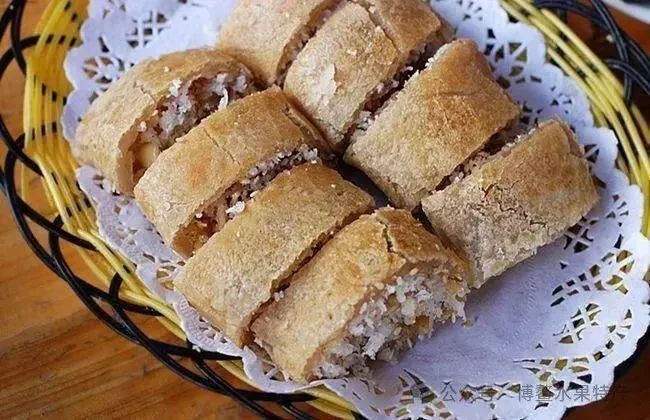 猪肠耙”的制作有一定的讲究,首先外皮一定要用糯米粉团,需要先将糯米泡十多个小时,煎制时锅内放油,待锅热后将湿糯米粉团放下锅里,当糯米饼烤制成金黄,外酥内香的薄饼最为完美。接着将饼平铺,一层层均匀撒上馅料和花生,然后卷边切片便统统搞定。