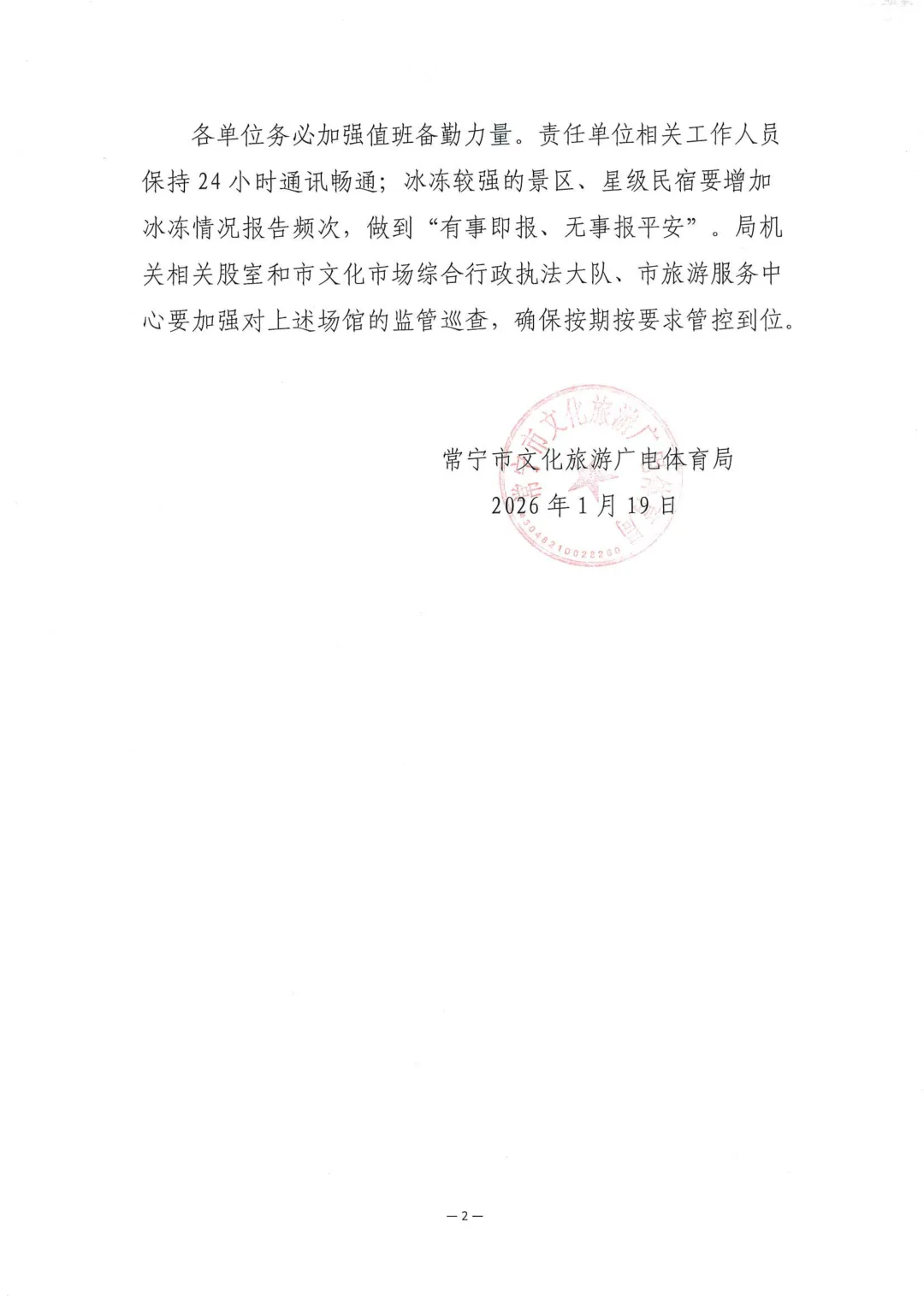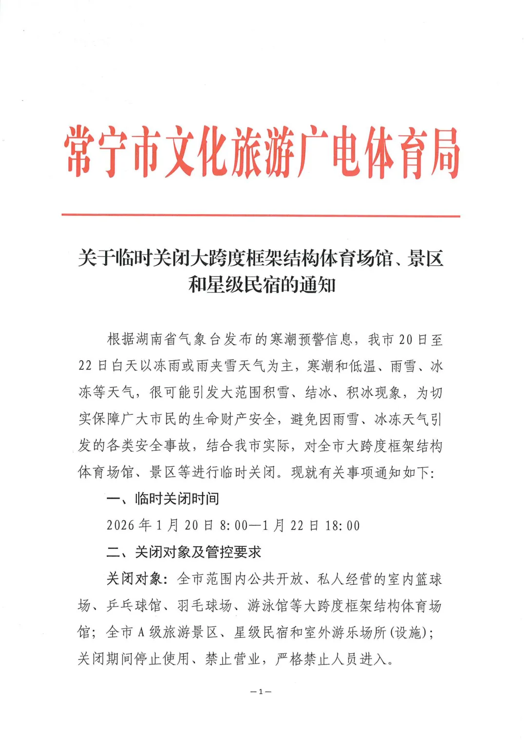 根据湖南省气象台发布的寒潮预警信息,我市20日至22 日白天以冻雨或雨夹雪天气为主,寒潮和低温、雨雪、冰冻等天气,很可能引发大范围积雪、结冰、积冰现象,为切实保障广大市民的生命财产安全,避免因雨雪、冰冻天气引发的各类安全事故,结合我市实际,对全市大跨度框架结构体育场馆、景区等进行临时关闭。现就常宁文旅公司旗下景区临时关闭有关事项通知如下: