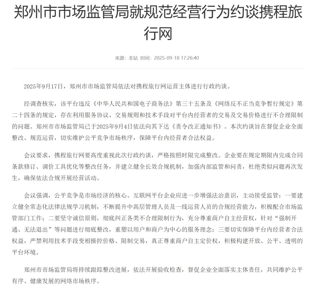 2025年9月,郑州市市场监管局已就此事约谈携程并下达《责令改正通知书》,这种算法驱动的定价操控,不仅剥夺了商家的自主定价权,还通过低价竞争进一步排挤中小平台,强化自身的垄断地位。