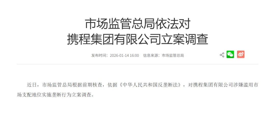 2026年1月14日,国家市场监管总局对携程集团(09961.HK)涉嫌滥用市场支配地位实施垄断行为立案调查的公告,引发资本市场与在线旅游行业的剧烈震动。