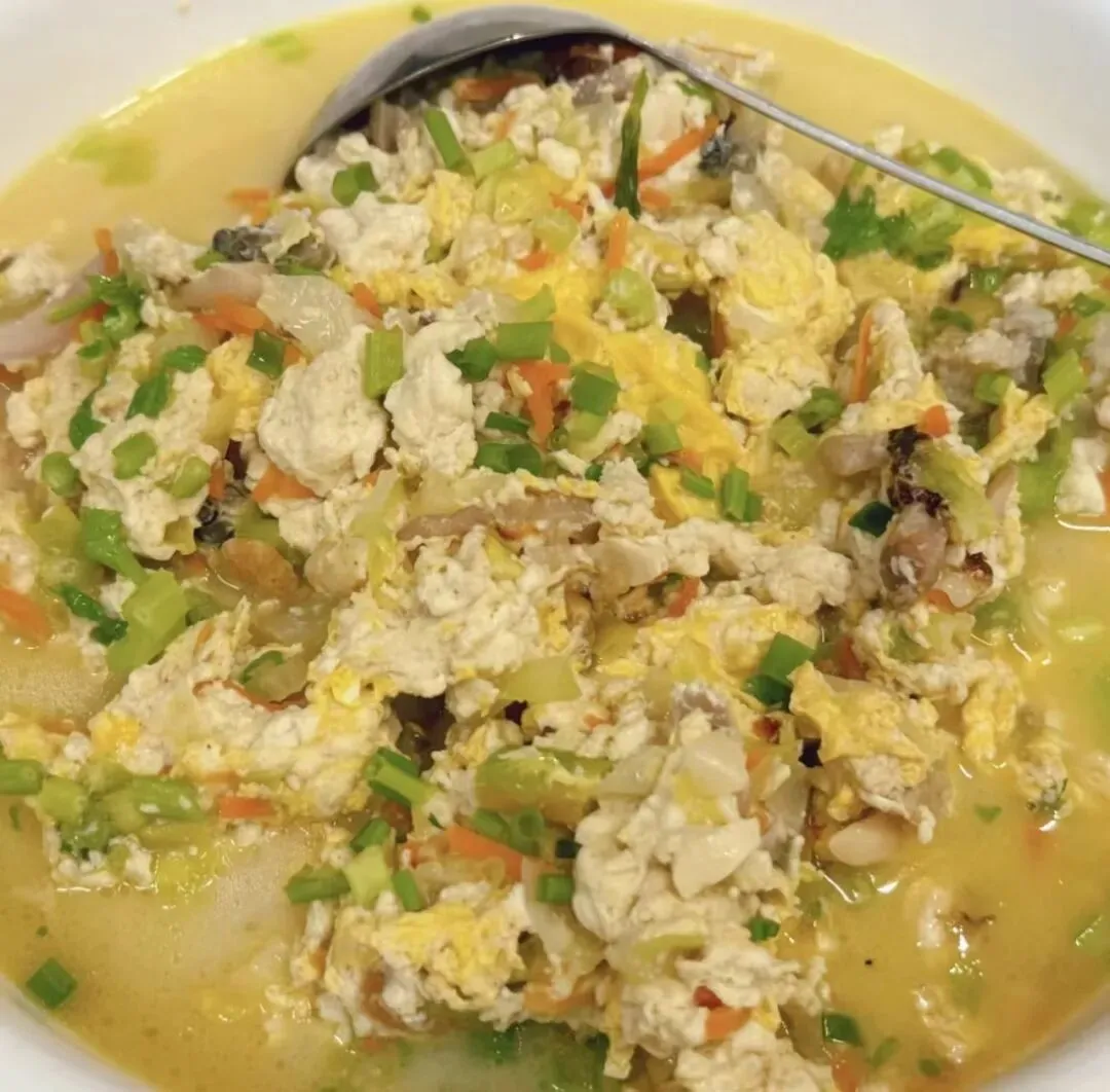 焖豆腐:莆田过年过节必备,用豆腐肉沫萝卜丝蛏子干各种食材一起焖,最后浇上蛋液定型,莆田酒席一般冷盘后第一道菜就是焖豆腐,盛一碗,再浇一点沾沾醋(莆田叫法,调出来的特别好吃)