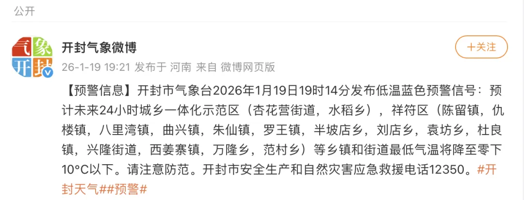 开封市气象台2026年1月19日19时14分发布低温蓝色预警信号: