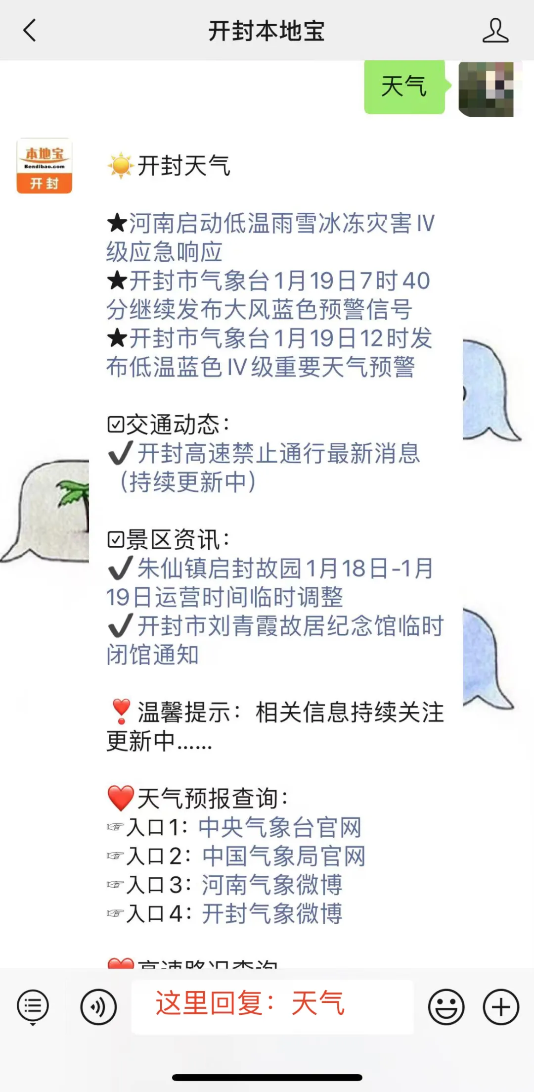 在聊天对话框回复【天气】