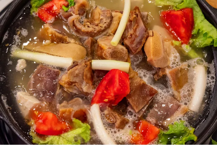 云南丽江腊排骨火锅 丽江山海拔2500米以上的黑山羊,肉质鲜嫩无膻味,带皮煮进锅里,汤头熬得乳白醇厚。肥瘦相间的羊肉煮得酥烂,入口即化,还能益气补虚,特别适合抵御高原的微凉。一定要搭配本地菌类,吸饱肉汤的菌子鲜到上头,蘸上特制辣椒面,一口肉一口汤,从嗓子眼暖到肚脐眼。