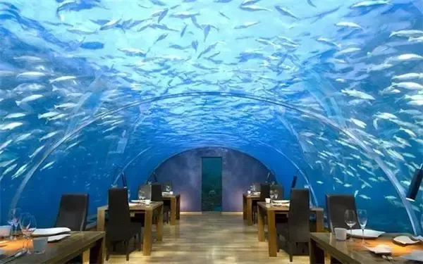 马尔代夫ithaa餐厅是世界上第一家水下餐厅,ithaa在当地语意思为“珍珠”。如果你是个研究美食,又讲求浪漫的人,那这里绝对是你最好的体验。餐厅位于温暖的太平洋水下5米处,可容纳14人同时就餐,四壁完全由玻璃制成,在餐厅里你看到的是颜色艳丽的珊瑚、暗礁,各种海洋生物在珊瑚礁间穿梭往 来,仿佛一不小心,鱼儿就游到了自己的盘子里,在品尝美味的同时尽情观赏绚丽多姿的海洋世界,所谓“食色”天堂!