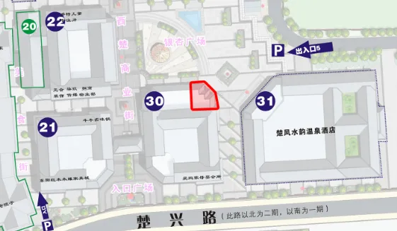 商铺位置:2号楼南侧二层-景区出口(图中标红区域)