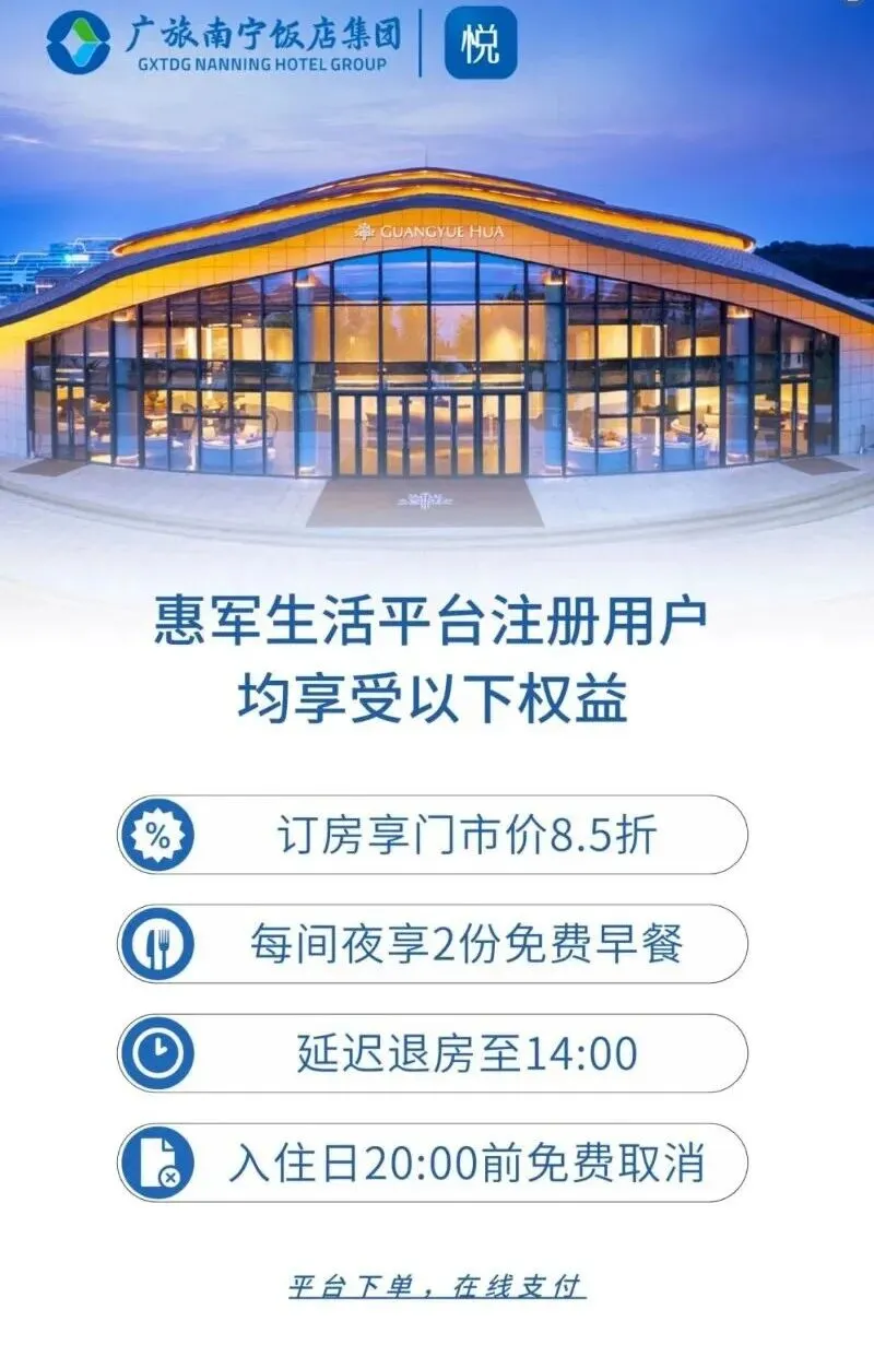 优惠活动:凡现役军人、三属、退役军人可以享受入住8折优惠、餐厅用餐贵宾9折。