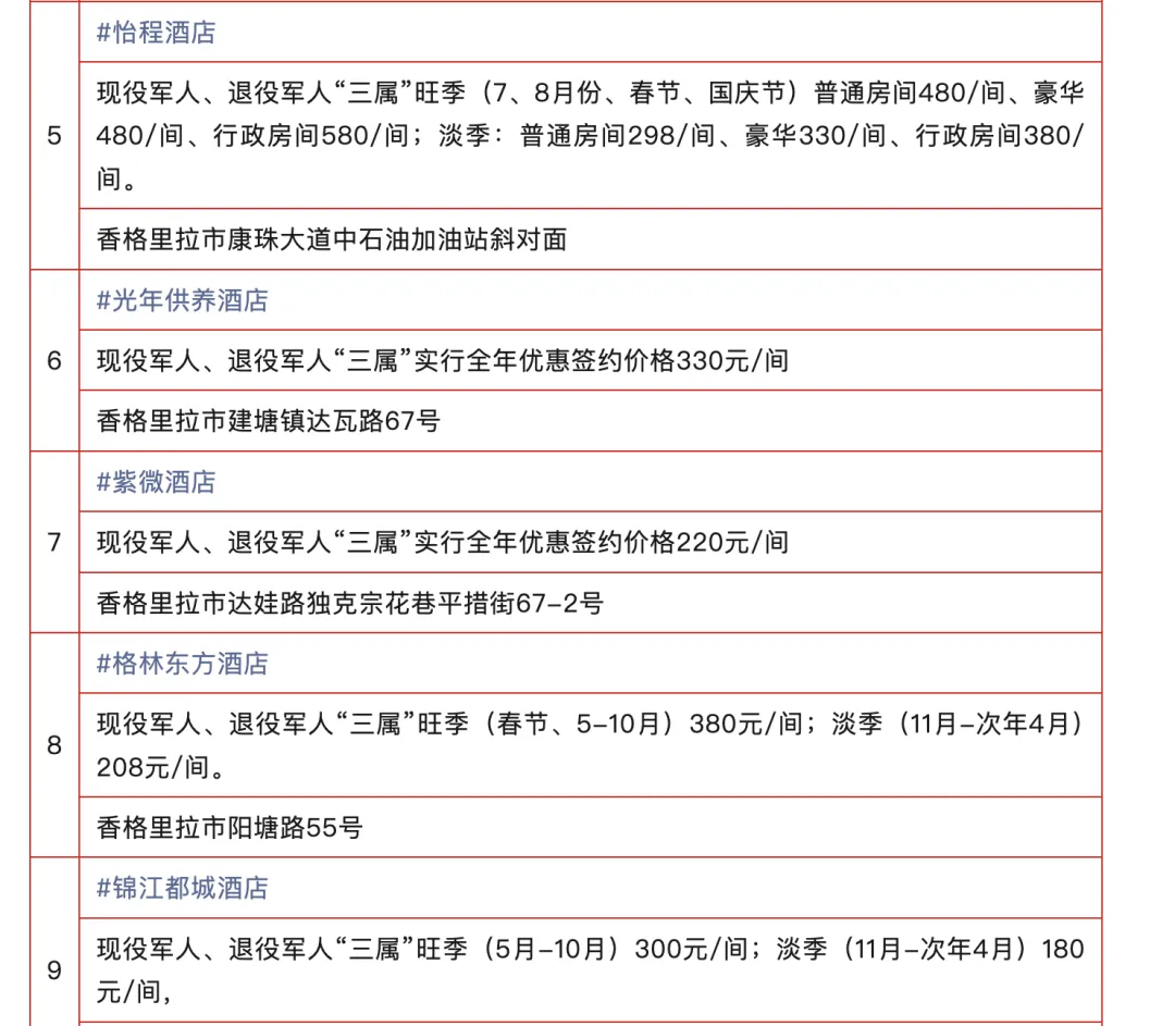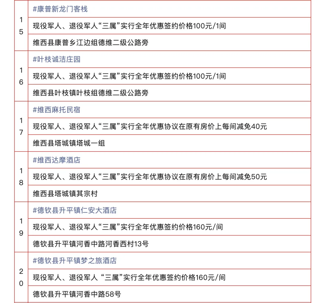 1、现役官兵及家属、退役军人、消防员凭相关凭证提供优惠服务享受协议价8折入住(赠送免费早餐、欢迎水果、下午茶、宵夜、免费洗烘衣物等多项增值服务)、房间免费升级;