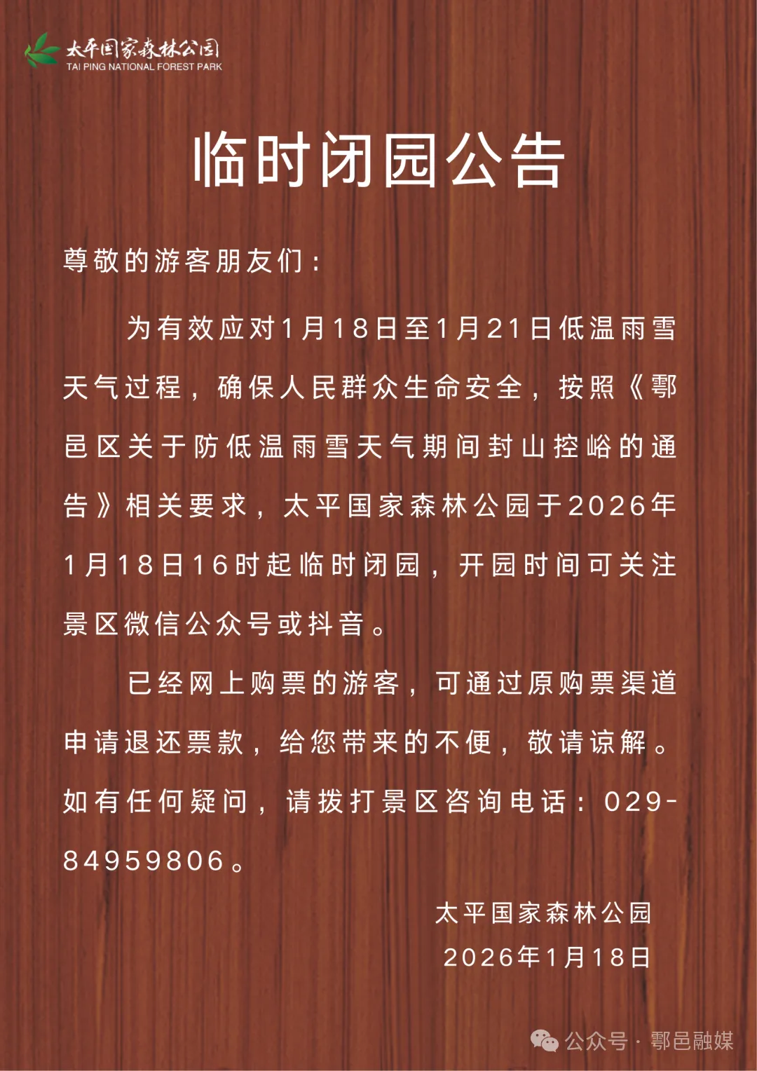 按照鄠邑区关于防低温雨雪天气期间封山控峪的通告相关要求,朱雀国家森林公园于1月18日起临时闭园,开园时间请留意公众号或官方抖音号。已网上购票的游客,可通过原购票渠道申请退款,给您带来不便,敬请谅解!