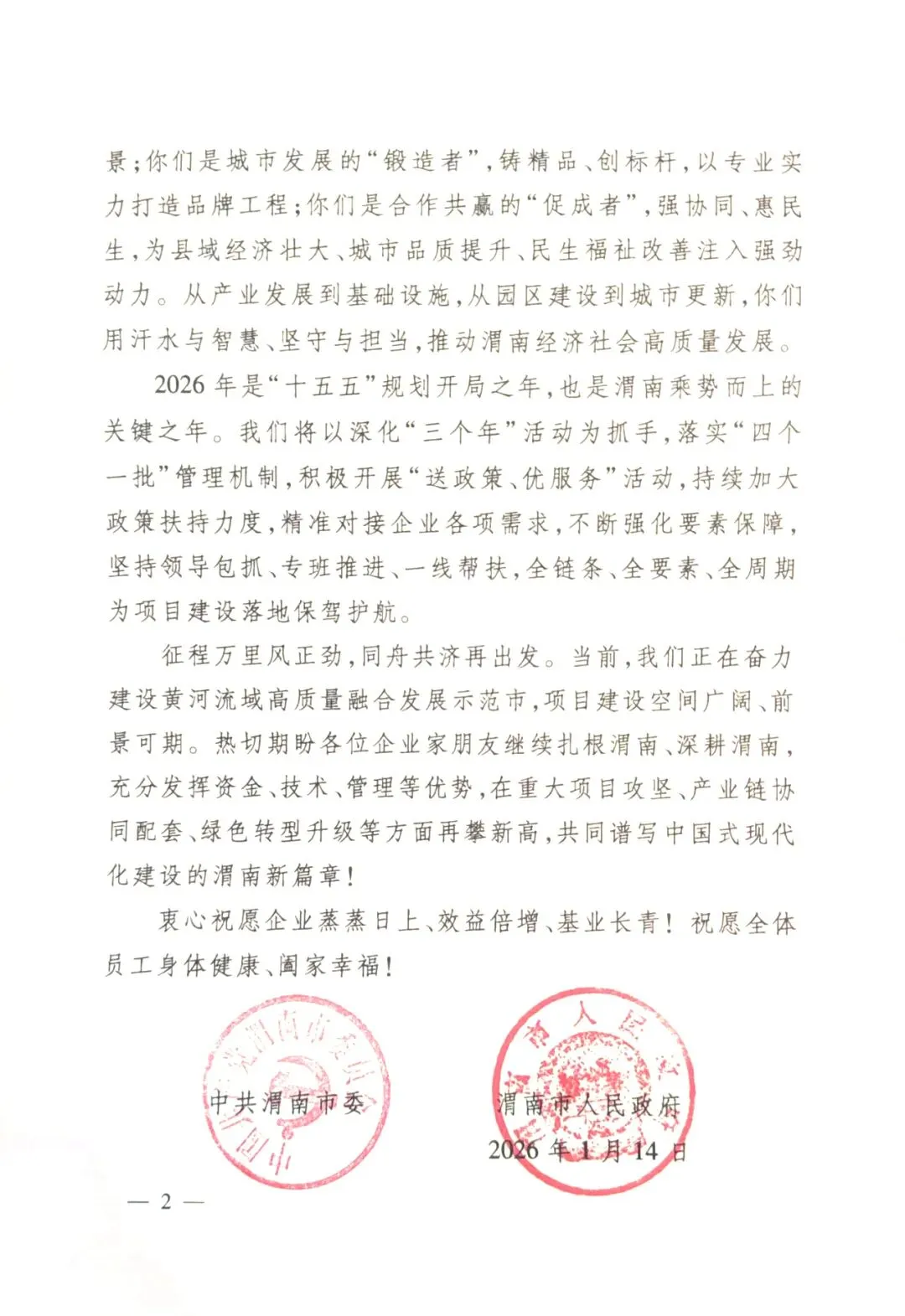 2026年是“十五五”规划开局之年,站在新的起点上,新基建公司将继续发扬“向善力建”的企业精神,扎根渭南、深耕渭南,用汗水与智慧、坚守与担当,为助推渭南经济社会高质量发展贡献更多力量。