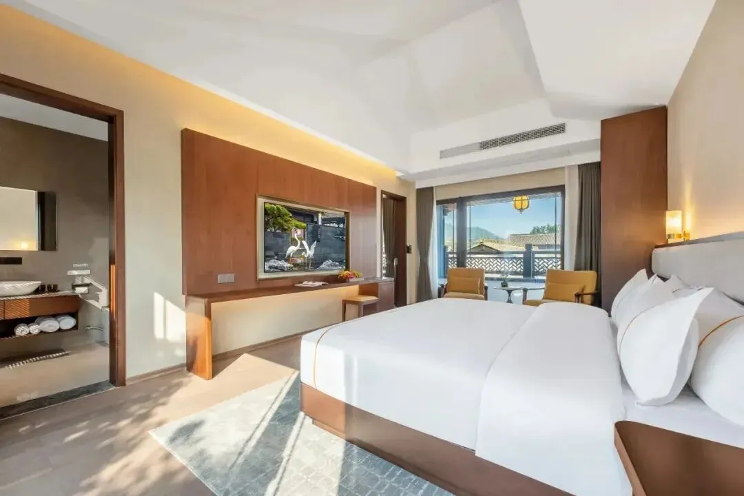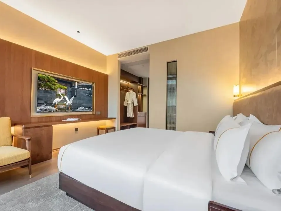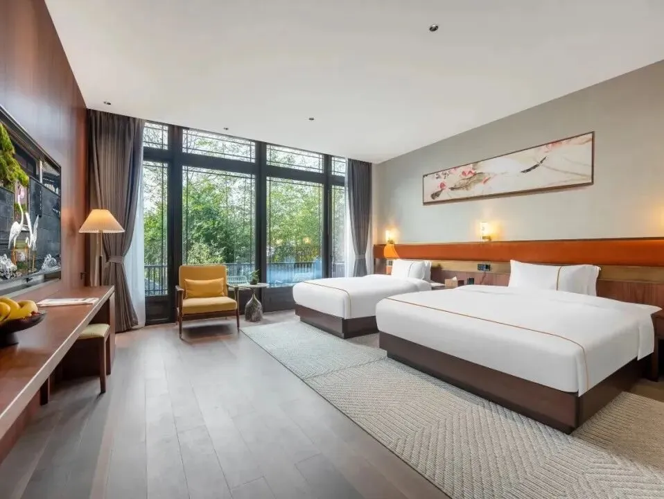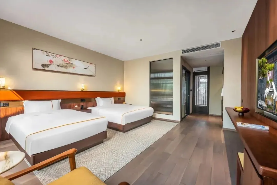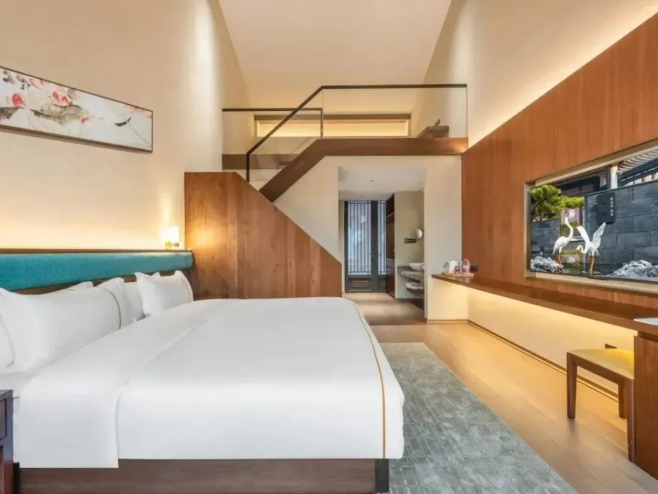 雷迪森颐墅酒店并非一座孤立的建筑,而是与4A级园林景区共生共长的“活态画卷”。29间客房如星辰般散落于亭台阁楼之间,青瓦飞檐、斗拱层叠,勾勒出宋明古韵的轮廓。其中17间中式;12间简约的设计风格均会让人眼前一亮。