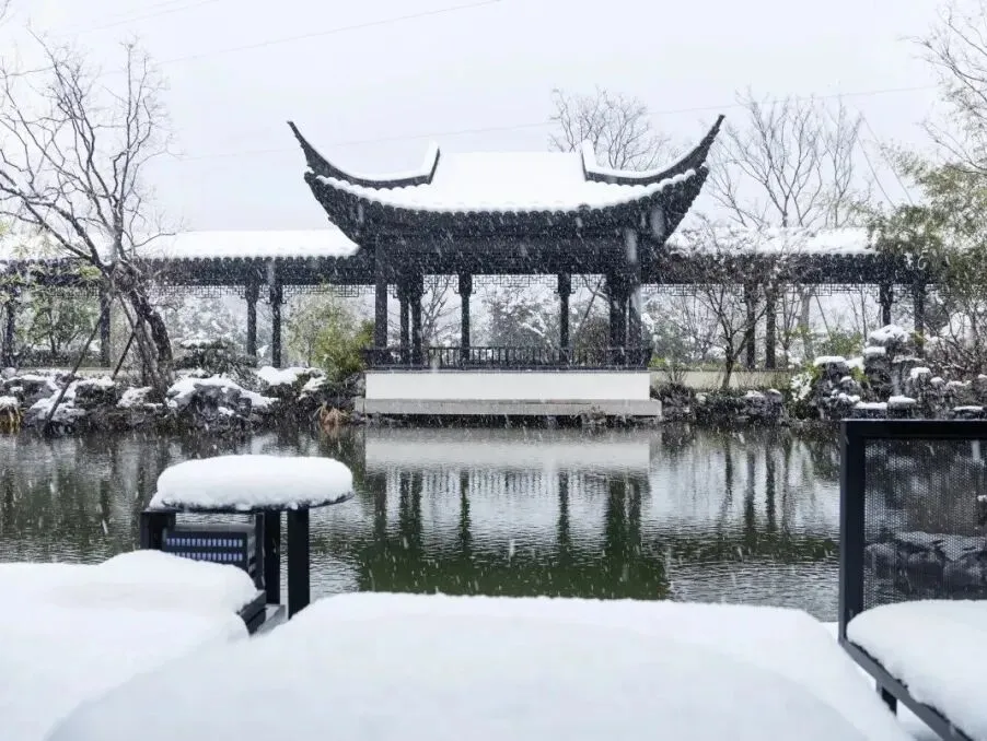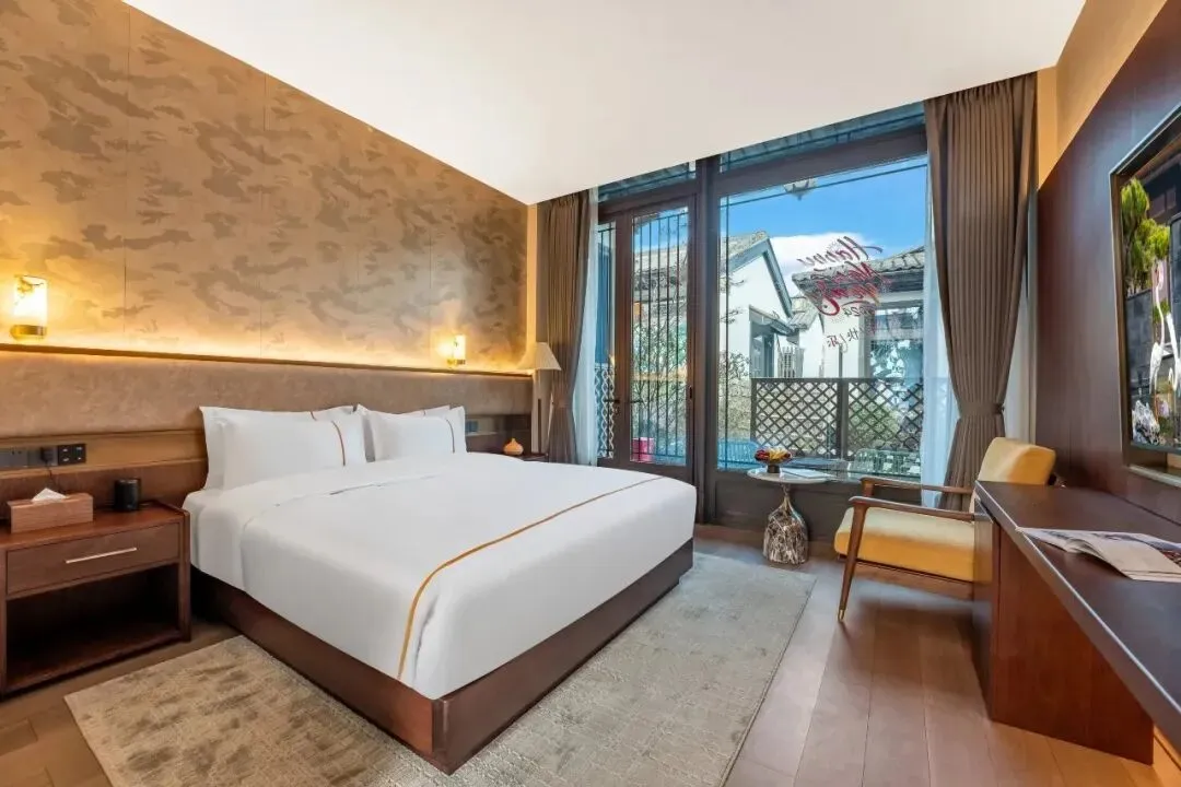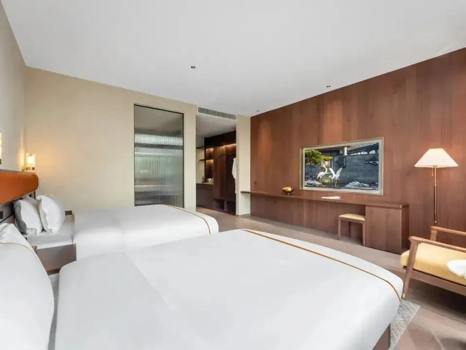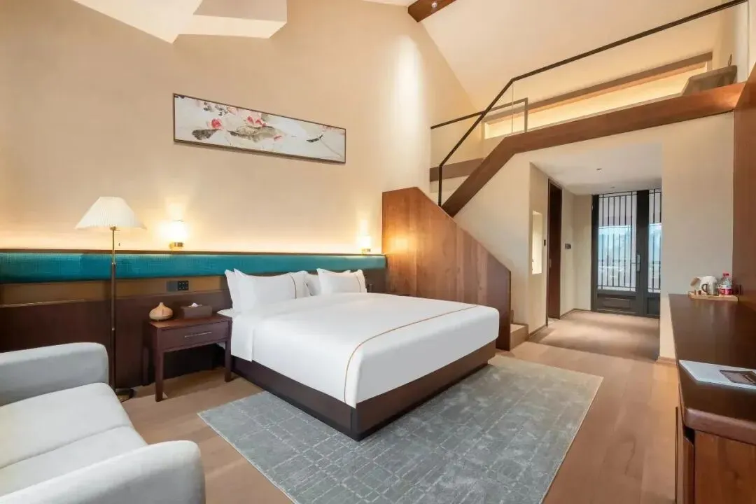 雷迪森颐墅酒店并非一座孤立的建筑,而是与4A级园林景区共生共长的“活态画卷”。29间客房如星辰般散落于亭台阁楼之间,青瓦飞檐、斗拱层叠,勾勒出宋明古韵的轮廓。其中17间中式;12间简约的设计风格均会让人眼前一亮。