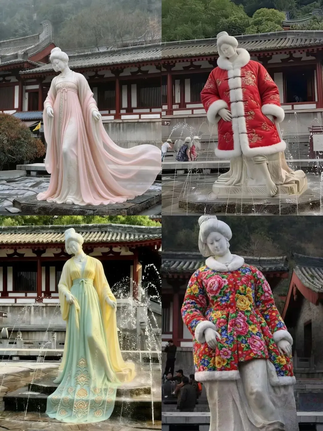 一些网友认为如果既定事实已无法更改,那就摊平差异。“既然是艺术,那怎么能让贵妃一个人艺术?”,大家建议李隆基作为华清池真正的主人也应该以类似造型出现在景区。 还有乐子人干脆玩上了“奇迹环环”,给贵妃各种换装。 许多热心人士担心石头冻着,帮雕像p上了大花棉袄。AI不懂什么传统服饰的朝代、形制,只会根据指令胡乱瞎穿。