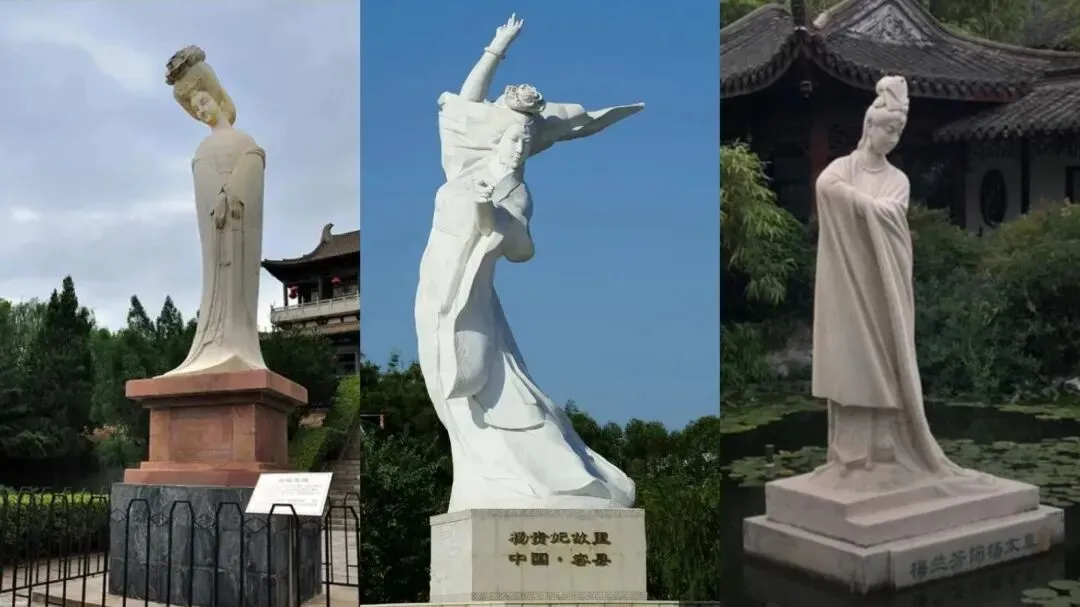 大家宁可把杨玉环打扮得又土又俗、不伦不类,也不愿让她继续裸着。 虽然图片有一定恶搞成分在,但也能看出这届网友们帮她穿上衣裳的心有多么急切了。 另外,其他地区造型各异的杨贵妃雕像也在这波争议中涌现出来。 其中被高频拿出来做案例的有陕西兴平马嵬坡杨贵妃墓的雕像、广西容县杨贵妃故里的雕像,还有江苏泰州梅园里梅兰芳扮演的贵妃角色像。