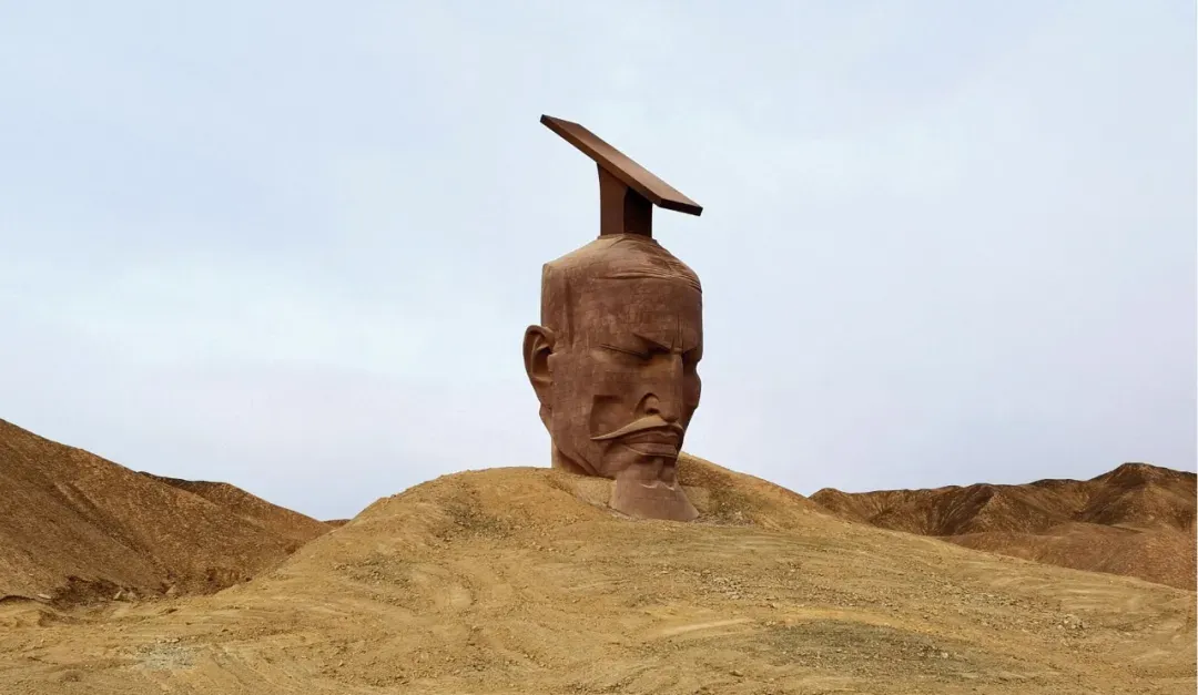 这届高速冲浪的网友,上一张和景区雕塑的合照大概率还是在十几年前的某次暑假旅游。如今全国各地的景区开发越来越成熟,大家可玩可拍的东西很多,一成不变的雕塑就显得并不“吸睛”了,许多人甚至不记得自己去过的景区都有哪些雕像。 除非,它被卷入了互联网上吵得不可开交的话题中。 首当其冲的就是甘肃瓜州戈壁国际雕塑艺术长廊内的雕像作品《汉武雄风》。 这座雕塑高达15米,造型为眉头紧皱的巨型汉武帝头像。因为表情凝重、且没有身体部分,作品被网友质疑“像是活埋汉武帝”“非常诡异的感觉”“好瘆人”……