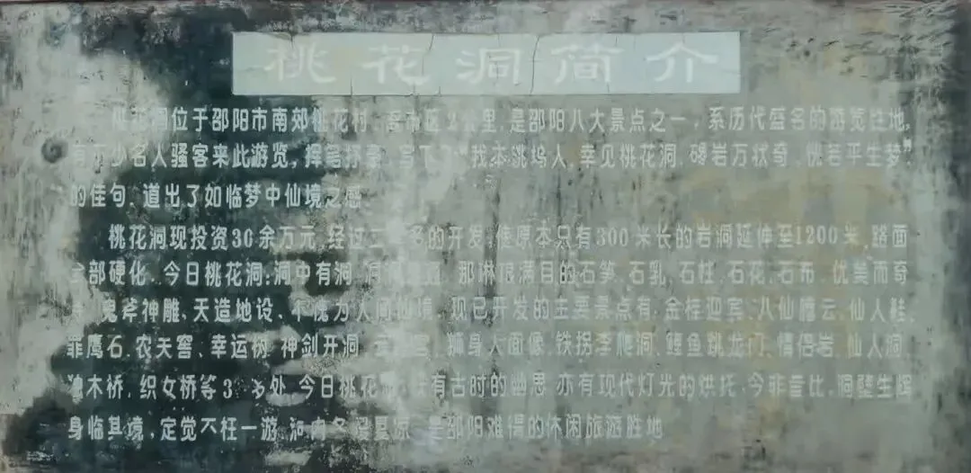 桃花洞洞前多桃树,春时桃花盛开,瓣落水中,流经石洞后,复由山后溪中流出。“桃洞流香”为“宝庆十二景”之一,洞长90米,宽5米,洞内有石灶、石床、石蹬。洞顶有一窦,盘旋可出。洞后有巨石矗立,上面题有“云根石”三字。明嘉靖三十六年曾在洞侧建有城南书院,今已不存。