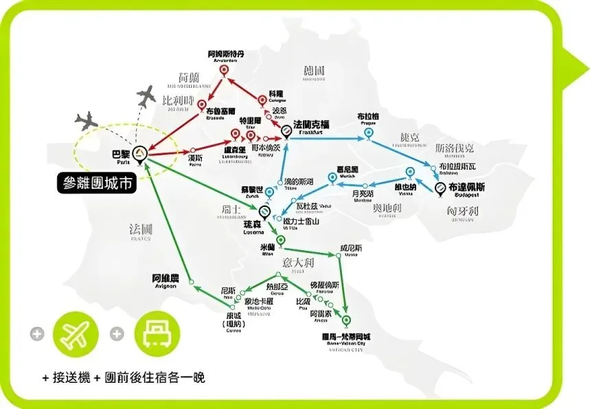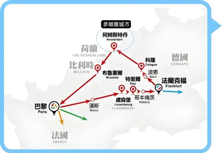 上下团地点可选:巴黎、科隆、阿姆斯特丹、布鲁塞尔、卢森堡、特里尔